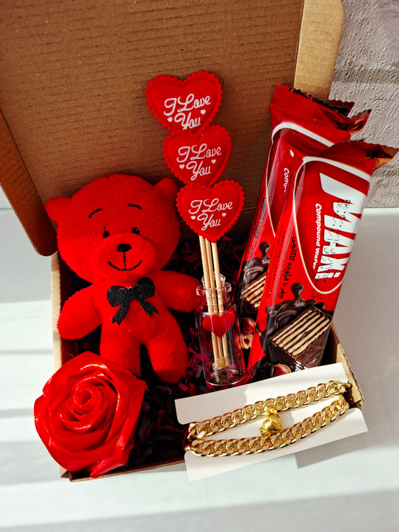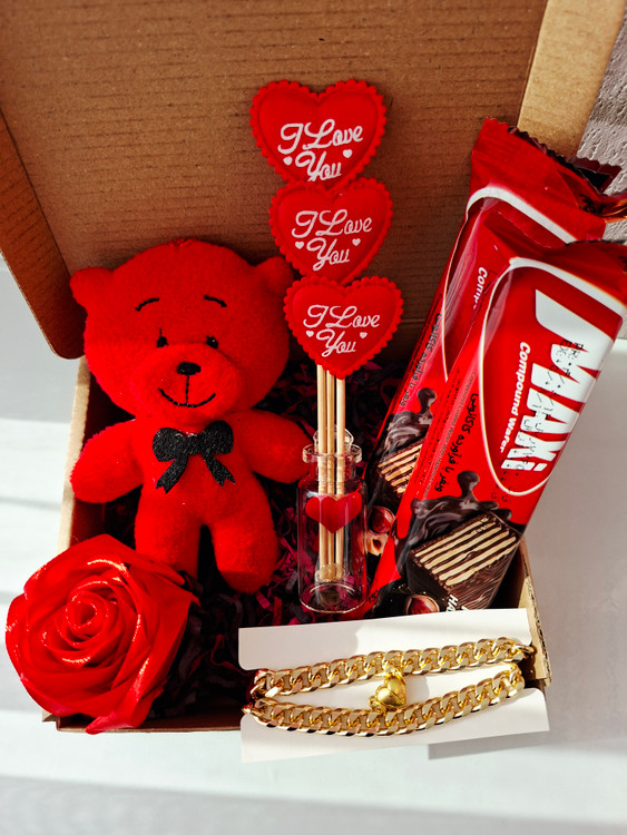 دو تا شکلات کاکائویی داره، ست دستبند دوستی مگنتی کارتیر که میتونید ست استفاده کنید، یه گل رز روبانی، شیشه عشق داره و یه عروسک خرسی بهمراه جعبه و پوشال