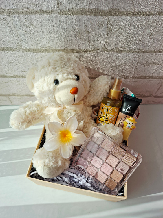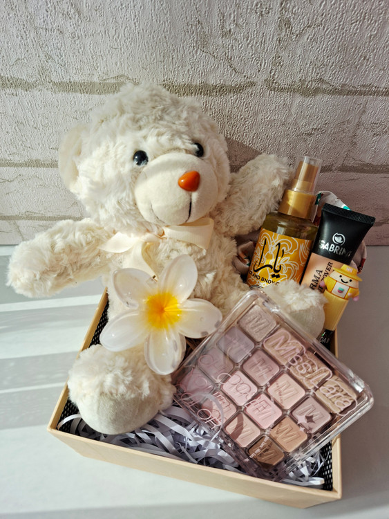 شامل عروسک خرس، پالت سایه اورجینال میس لارا، بادی اسپلش یارا، کرم پودر، برق لب عروسکی، کلیپس پلومریا، کش مو ساتن، پوشال و جعبه کادو