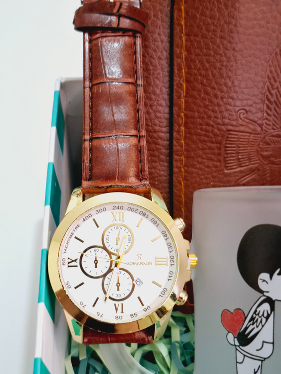 شامل ادکلن ۱۰۰میل جعبه دار رایحه کاپیتان بلک، عطر قلمی شیشه ای رایحه کاپیتان بلک، ماگ، کیف پول مردانه، ساعت بند چرم رومانسون کیفیت قوی طرح سه موتور، پوشال بهمراه جعبه کادویی