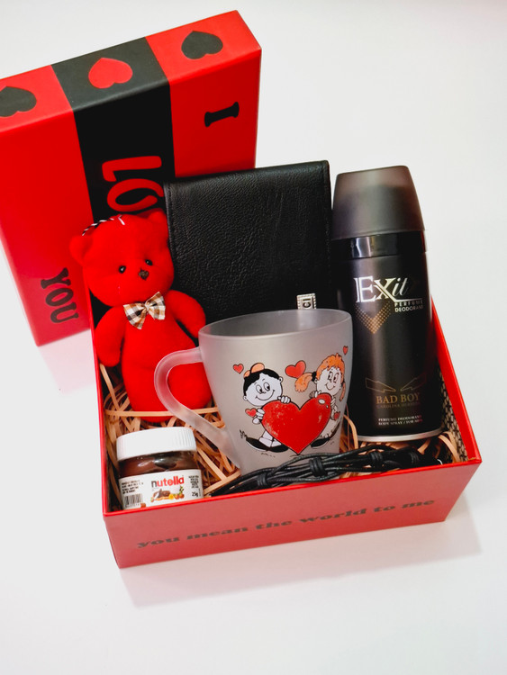 شامل اسپری خوشبو کننده بدن رایحه خوشبو، کیف پول مردانه، خرس تدی، لیوان طرح عاشقانه، شکلات نوتلا،دستبند چرم مردانه، پوشال بهمراه جعبه کادویی با کیفیت