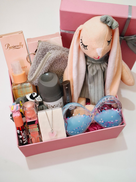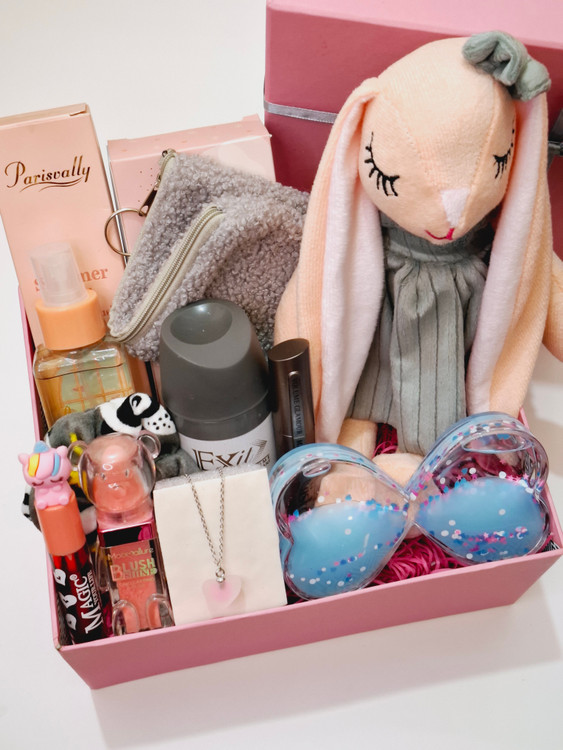شامل عروسک، قلب روغنی، بادی اسپلش پاستیلی، جامدادی تدی، اسپری خوشبو کننده بدن، ریمل ضدآب اورجینال کالیستا، کش مو مخملی، تینت لب فانتزی، رژگونه پودری عروسکی موکارله، گردنبند استیل رنگ ثابت قلبی، پوشال بهمراه جعبه کادویی