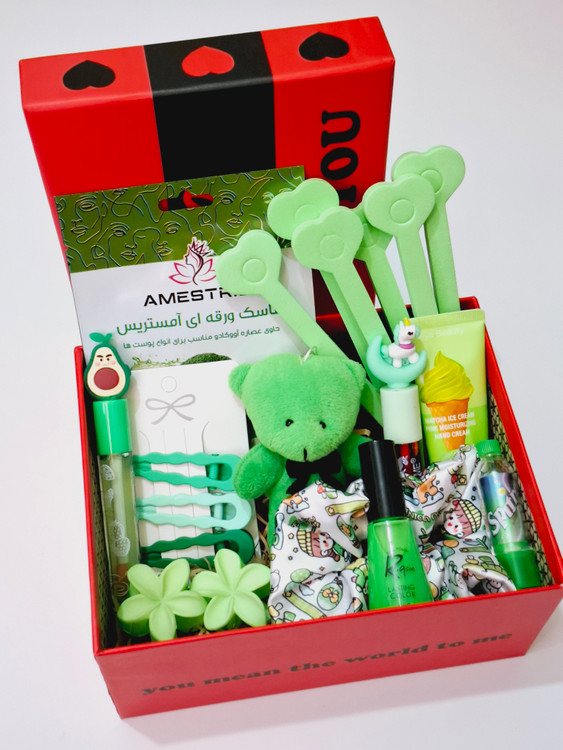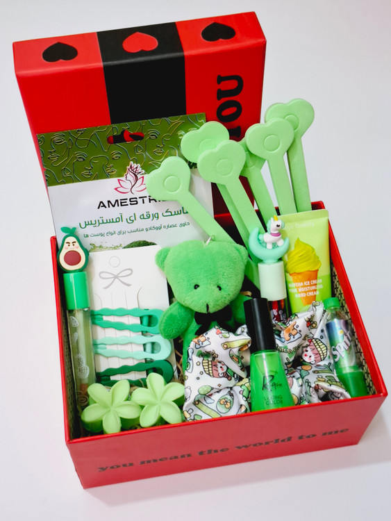 شامل بیگودی فومی، ماسک ورقه ای، برق لب فانتزی، پک گیره 3تایی، خرس تدی، تینت لب فانتزی، اسکرانچی ساتن باکیفیت، کرم مرطوب کننده دست، بالم لب نوشابه ای، گیره مو پینترستی، پوشال بهمراه جعبه کادویی