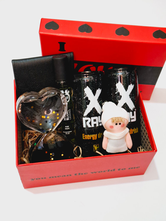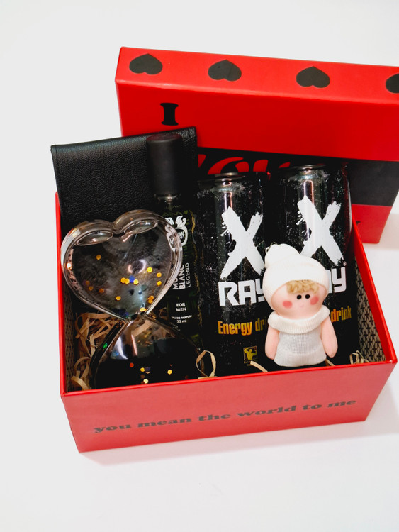 شامل کیف پول مردونه، قلب روغنی، 2عدد نوشیدنی انرژی زا، جاکلیدی عروسک روسی، عطر قلمی شیشه ای، پوشال بهمراه جعبه کادویی