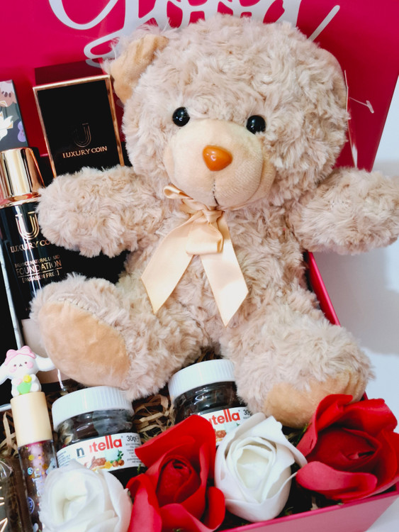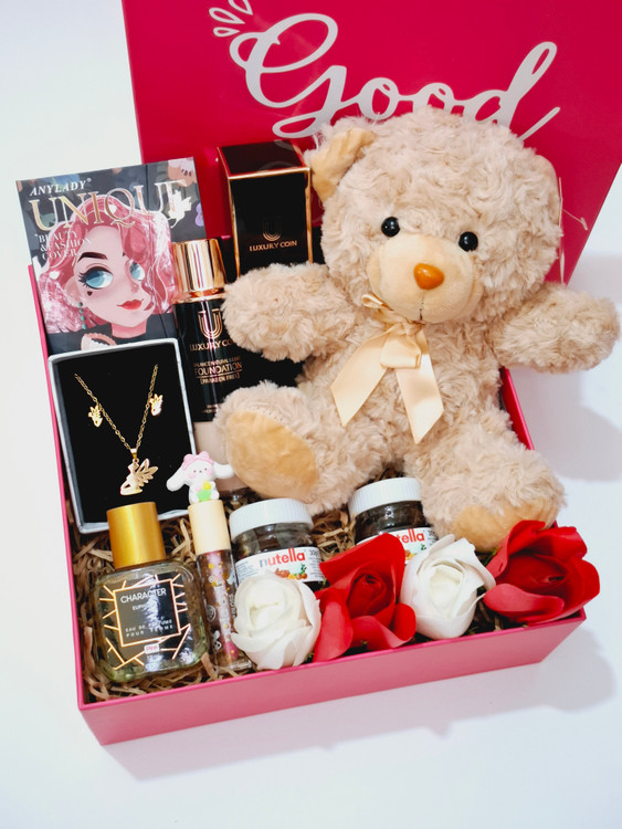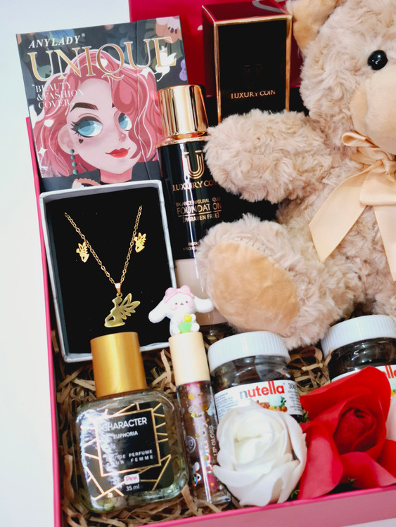 شامل خرس وارداتی باکیفیت، کرم پودر اورجینال لاکچری کوین، پالت سایه همه کاره آنی لیدی شامل سایه، رژلب، رژگونه و...نیم ست گردنبند و گوشواره استیل رنگ ثابت بهمراه جعبه، ادکلن دخترونه با پخش بوی عالی و ماندگاری بالا، لیپ گلاس فانتزی، ۲عدد شکلات نوتلا، گل لمسی، پوشال بهمراه جعبه کادویی