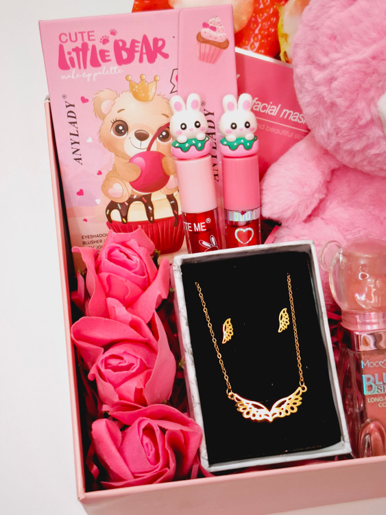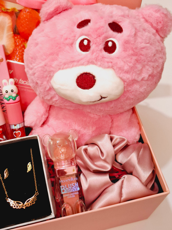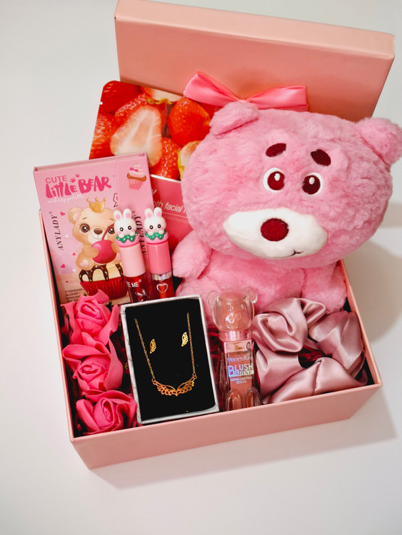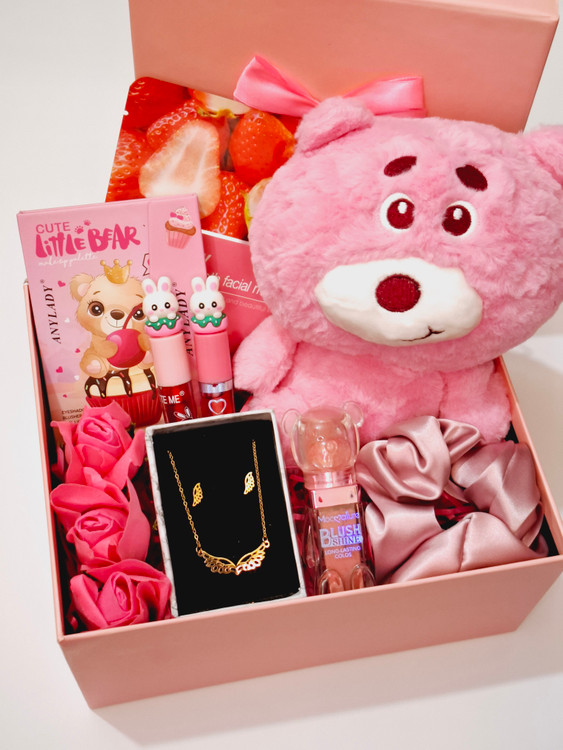 شامل عروسک خرس توت فرنگی، برق لب و تینت لب فانتزی، پالت سایه همه کاره آنی لیدی، گل، نیم ست گردنبند و گوشواره استیل رنگ ثابت بهمراه جعبه، ماسک ورقه ای، رژگونه پودری عروسکی موکارله، اسکرانچی ساتن باکیفیت، پوشال بهمراه جعبه کادویی