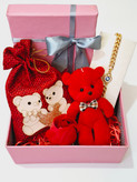 این باکس شامل دستبند استیل رنگ ثابت قلبی، خرس تدی، کیسه شکلات مخملی طرح خرسی، گل لمسی خارجی، پوشال بهمراه جعبه کادویی