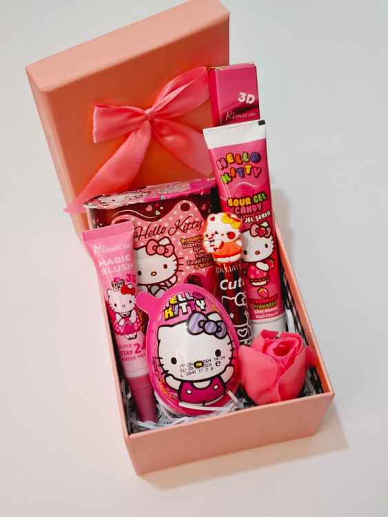 شامل رژگونه حرارتی کیتی، شکلات تیوپی کیتی، شکلات ویفری کیتی، لپ لپ تخم مرغی کیتی، تینت لب کیتی، گل، پوشال بهمراه جعبه کادویی