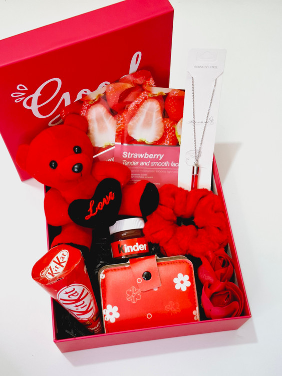 شامل عروسک خرس، ۲عدد ماسک ورقه ای، کیف جاکارتی، شکلات،گردنبند شیشه خون استیل رنگ ثابت، گل،کش مو مخملی، پوشال بهمراه جعبه کادویی