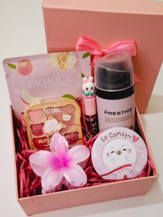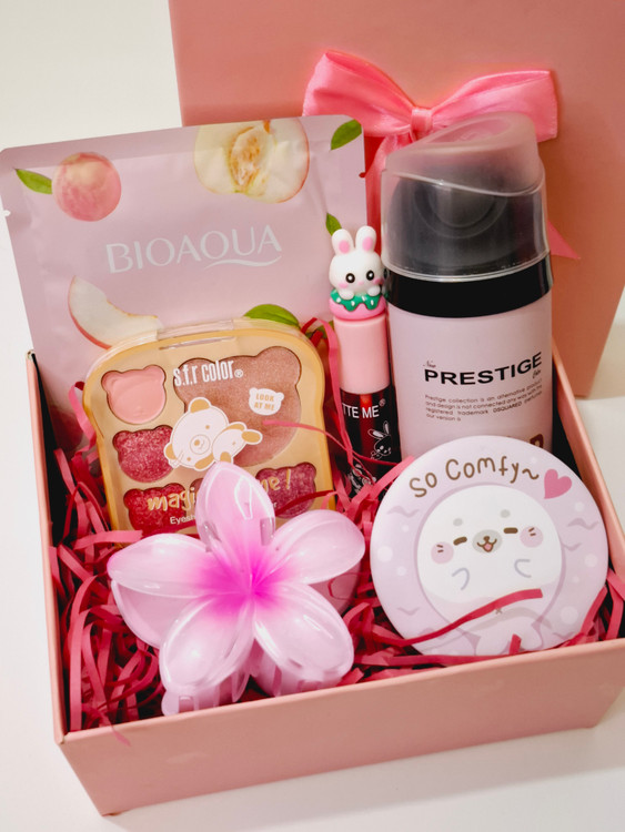 شامل اسپری خوشبو کننده بدن، پالت سایه خرسی، ماسک ورقه ای، کلیپس سایز بزرگ وارداتی پلومریا، تینت لب عروسکی، آینه فانتزی عروسکی، پوشال بهمراه جعبه کادویی