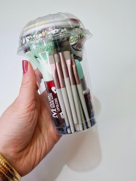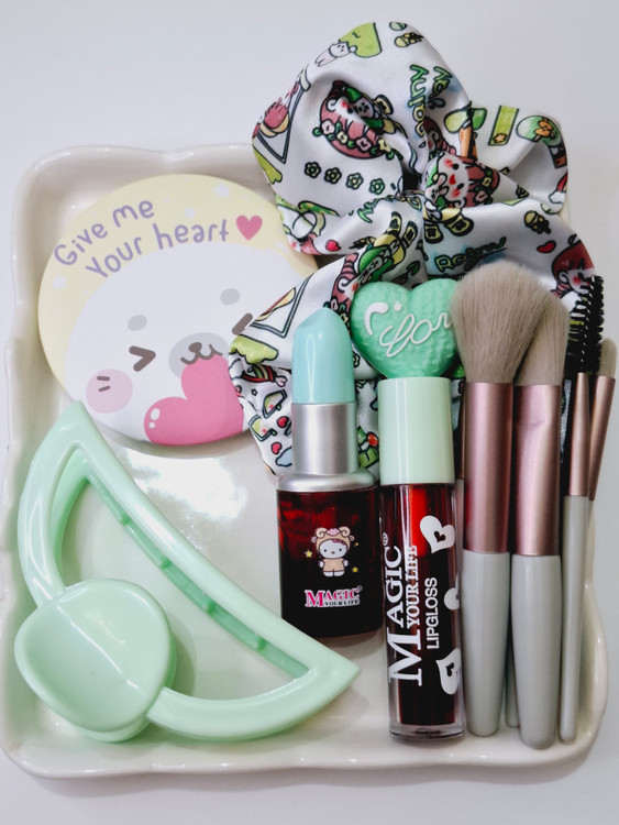 شامل ست براش ۸تکه، تینت لب فانتزی کیتی، آینه فانتزی عروسکی وارداتی، اسکرانچی ساتن باکیفیت، کلیپس سایز بزرگ، تینت لب فانتزی، پوشال بهمراه طلق آیس پک