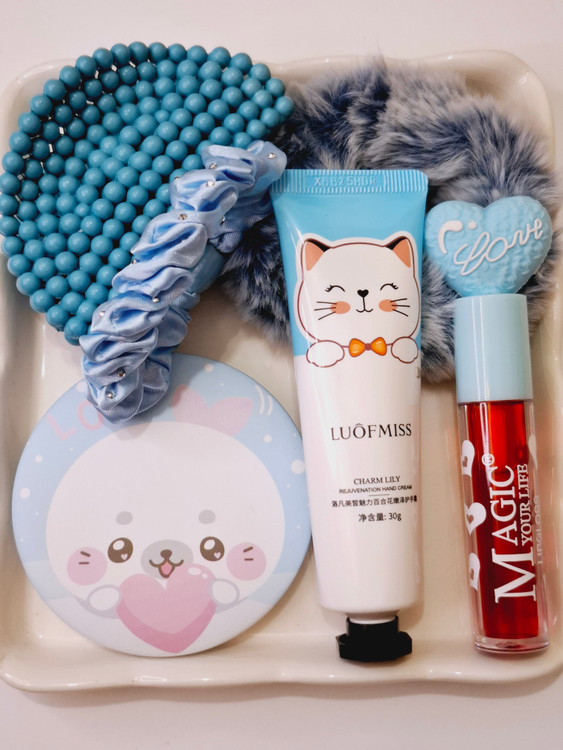 شامل کلیپس سایز بزرگ مرواریدی، کرم مرطوب کننده، کش مو نگین کاری شده، تینت لب فانتزی، آینه فانتزی عروسکی وارداتی، کش مو پشمالو، پوشال بهمراه طلق آیس پک