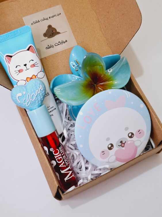 شامل آینه فانتزی عروسکی وارداتی، کلیپس پینترستی پلومریا، کرم مرطوب کننده، تینت لب فانتزی، پوشال بهمراه جعبه کادو