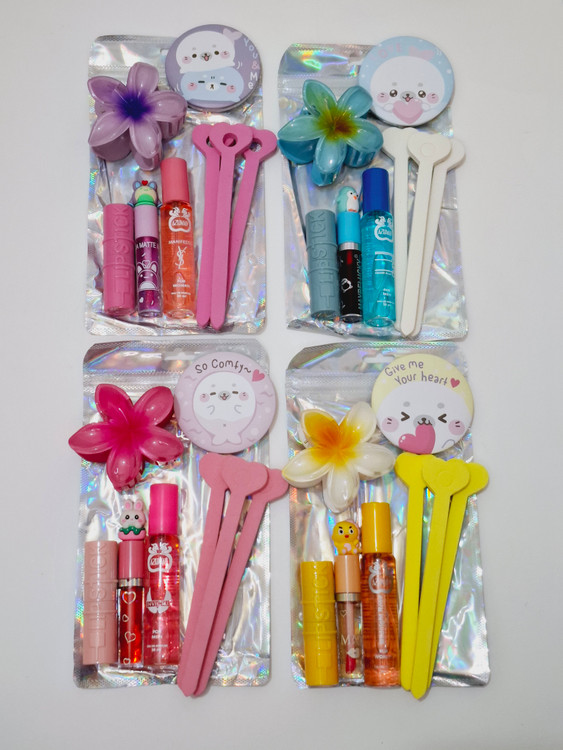 شامل کلیپس پینترستی پلومریا سایز بزرگ، آینه فانتزی عروسکی وارداتی، عطر قلمی شیشه ای، بالم لب فانتزی کاریته، برق لب فانتزی، بیگودی فومی، پاکت