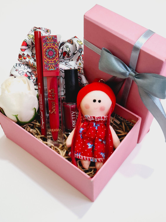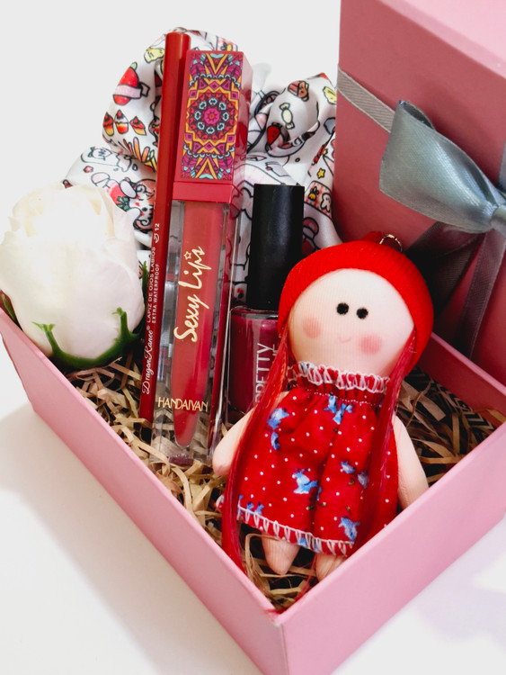 شامل اسکرانچی ساتن، خط لب پیچی اورجینال دراگون، رژلب مایع ۲۴ساعته ضدآب هندایان، گل، عروسک روسی جاکلیدی، لاک ناخن، پوشال بهمراه جعبه کادویی