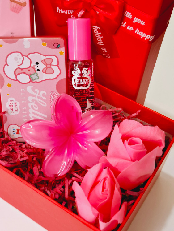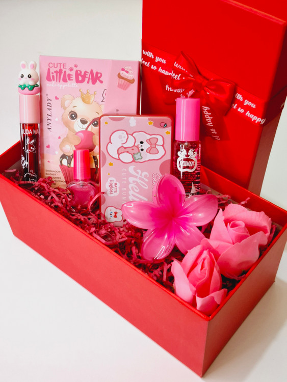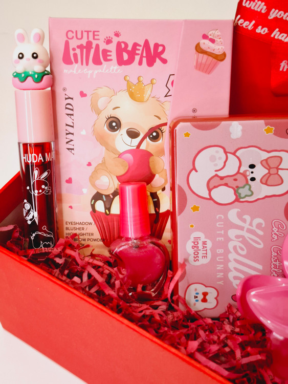 شامل پالت سایه همه کاره آنی لیدی، تینت لب فانتزی، عطر قلمی شیشه ای، کلیپس پینترستی پلومریا سایز بزرگ، پک رژلب ۵عددی خرسی کالرکاستل، لاک ناخن، گل، پوشال بهمراه جعبه کادویی