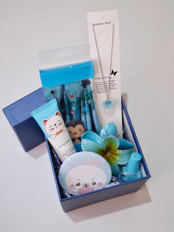 شامل ست براش، گردنبند استیل رنگ ثابت قلبی، کلیپس پینترستی پلومریا سایز بزرگ، کرم مرطوب کننده، لاک ناخن، آینه فانتزی عروسکی وارداتی، پوشال بهمراه جعبه کادویی