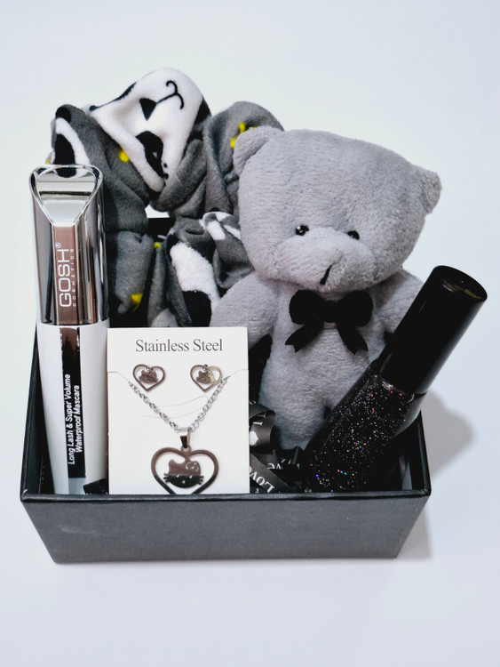 این پک شامل خرس، کش مو، لاک ناخن، نیم ست استیل گردنبند و گوشواره استیل رنگ ثابت، ریمل حجم دهنده و ضدآب گاش کیفیت درجه یک بهمراه جعبه کادویی و پوشال