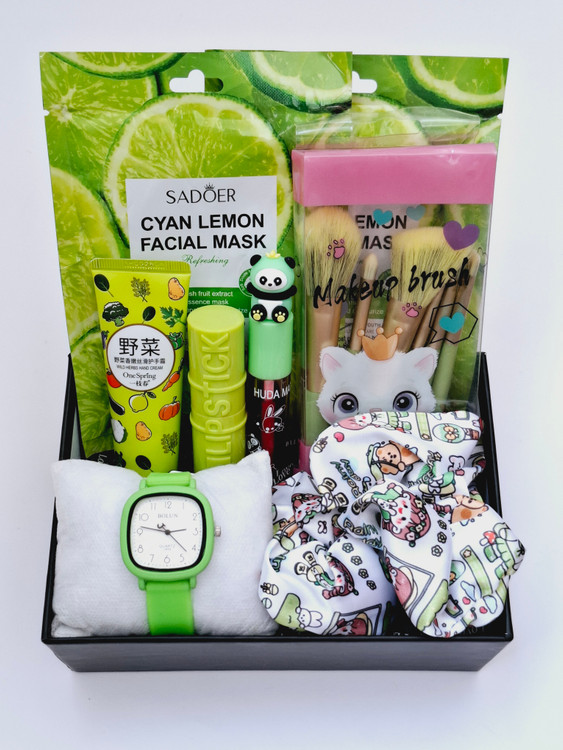 آیتم های پک شامل ۲عدد ماسک ورقه ای، ساعت بند نرم دخترانه پاستیلی بالون کیفیت قوی، اسکرانچی ساتن، بالم لب حرارتی کاریته، تینت لب فانتزی عروسکی، کرم مرطوب کننده، ست براش طلقی، پوشال بهمراه جعبه کادویی