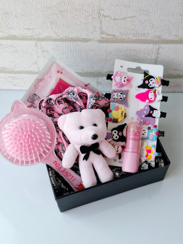 شامل پک گیره مو پینترستی کرومی، ماسک لب، خرس، بالم لب خرسی، اسکرانچی ساتن باکیفیت، برس آکواریومی دخترانه، پوشال بهمراه جعبه کادویی