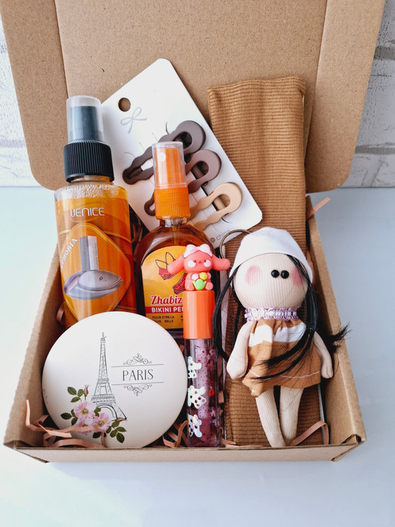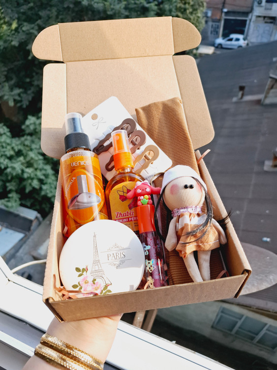 این باکس شامل هدبند کبریتی، عروسک، بادی اسپلش،کش مو، بیگودی فومی، عطر، کلیپس، برق لب فانتزی، آینه فانتزی دو طرفه،پوشال بهمراه جعبه کادویی