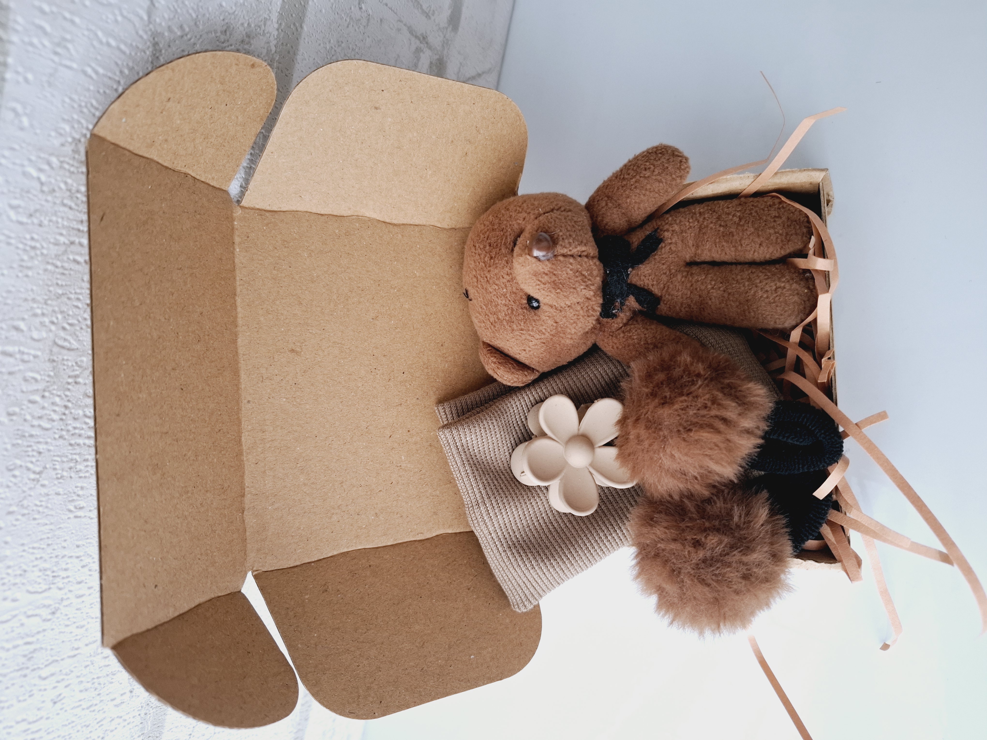 این باکس شامل خرس، هدبند، ۲عدد کش مو پوم پومی بهمراه کلیپس، پوشال و جعبه