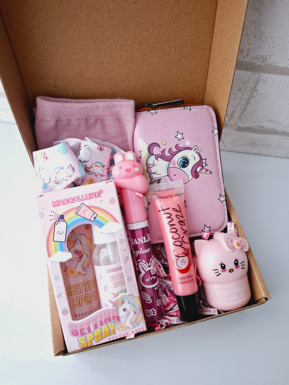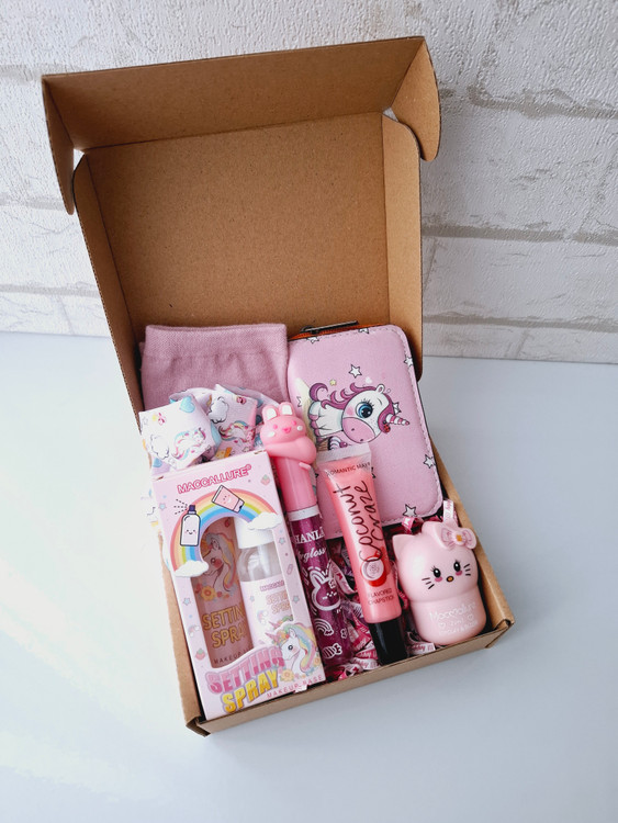 این باکس شامل جوراب دخترانه باکیفیت، کش مو ساتن، کیف جاکارتی فانتزی، لیپ مود فانتزی کیتی، لیپ گلاس، ست پرایمر و اسپری فیکس یونیکورنی، پوشال بهمراه جعبه