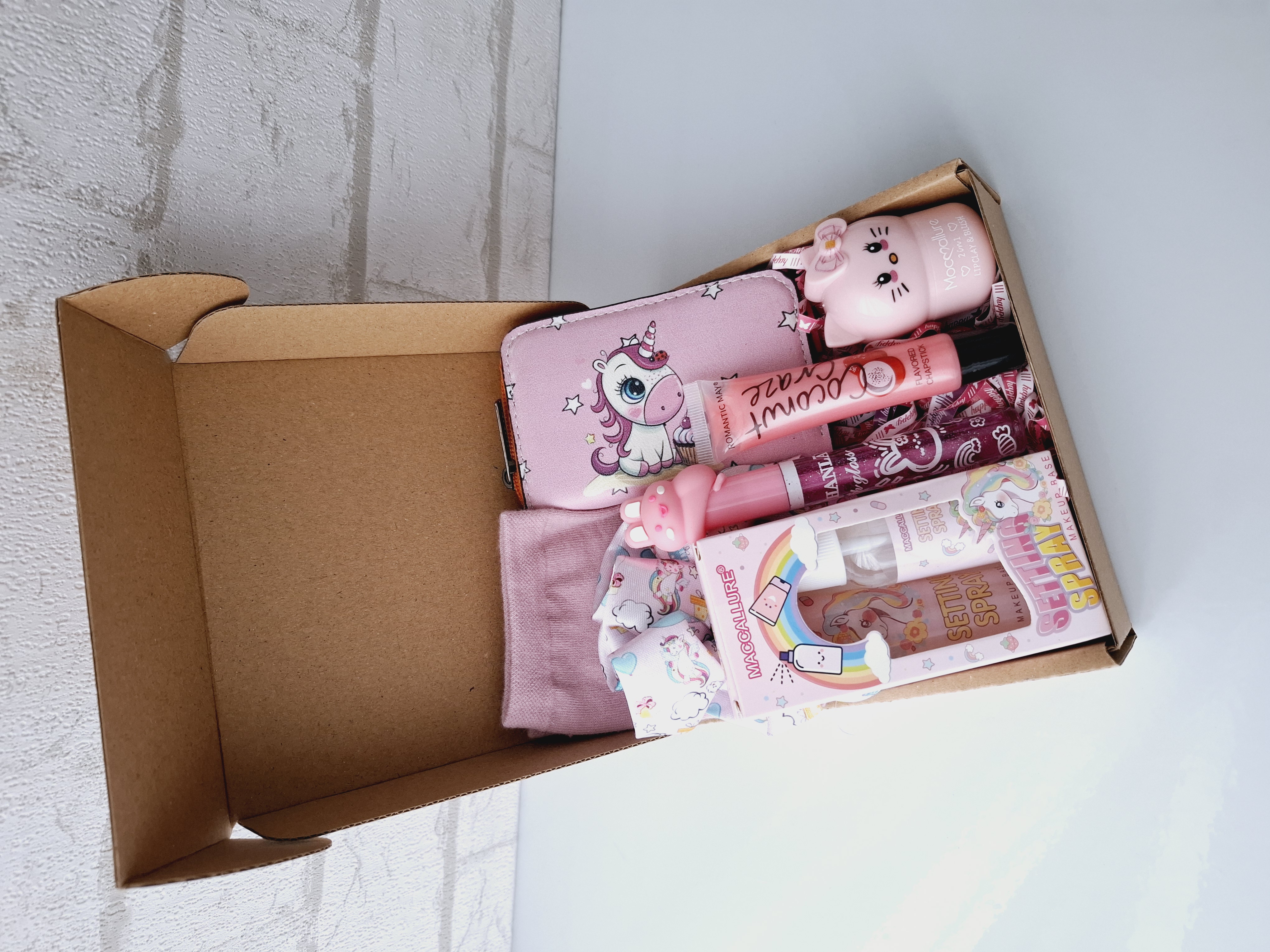 این باکس شامل جوراب دخترانه باکیفیت، کش مو ساتن، کیف جاکارتی فانتزی، لیپ مود فانتزی کیتی، لیپ گلاس، ست پرایمر و اسپری فیکس یونیکورنی، پوشال بهمراه جعبه