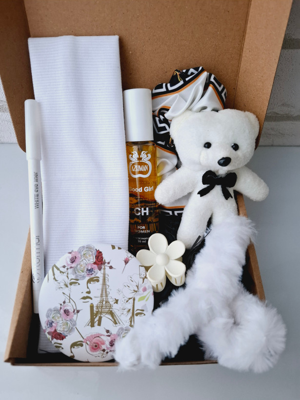این باکس شامل هدبند کبریتی، خرس، عطر قلمی شیشه ای، آینه فانتزی دوطرفه، کلیپس پشمالویی، گل سر، مداد چشم، کش مو، پوشال بهمراه جعبه
