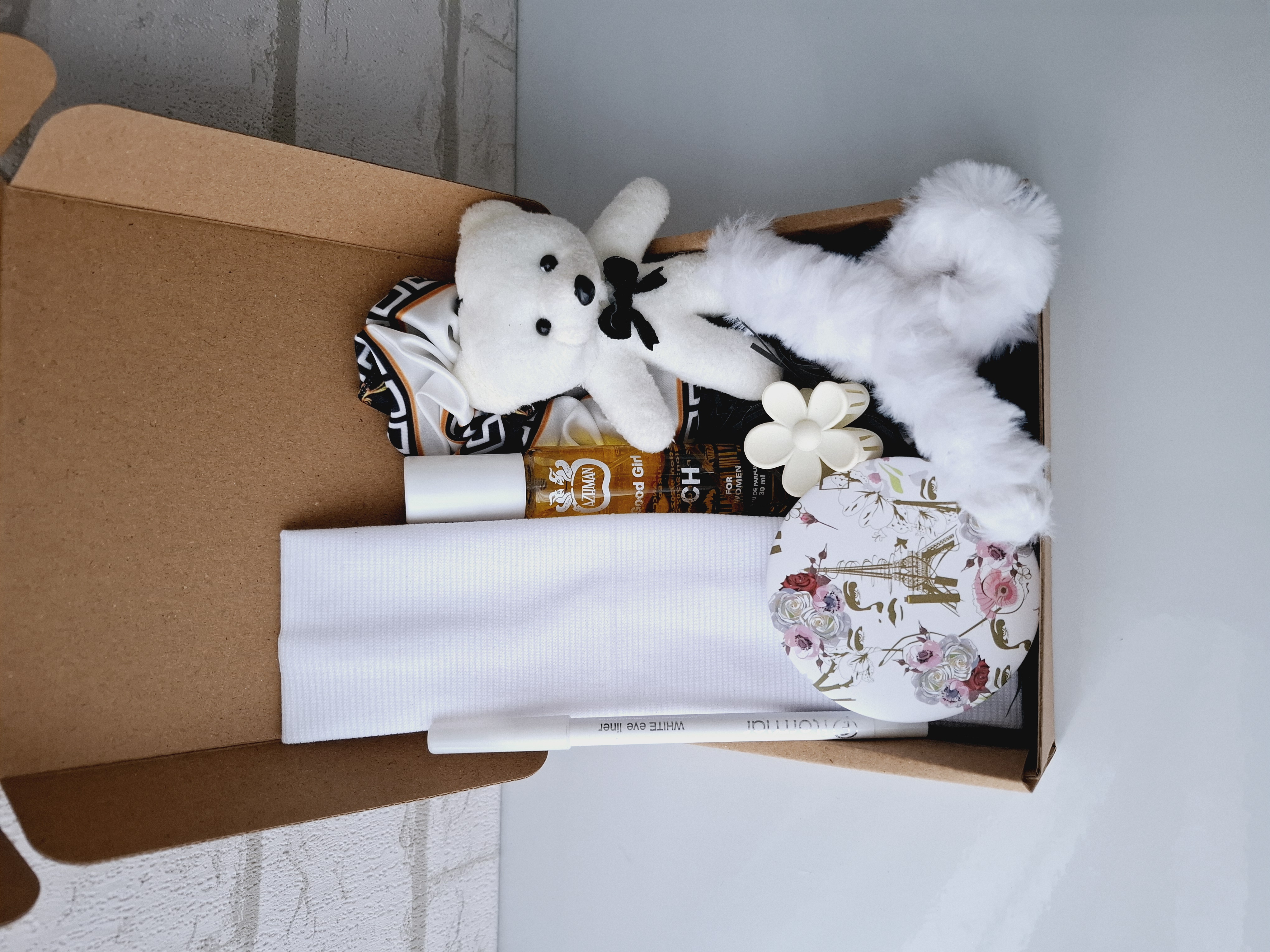 این باکس شامل هدبند کبریتی، خرس، عطر قلمی شیشه ای، آینه فانتزی دوطرفه، کلیپس پشمالویی، گل سر، مداد چشم، کش مو، پوشال بهمراه جعبه