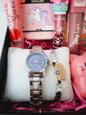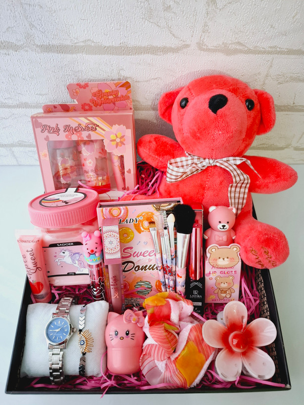 شامل ساعت بند فلزي استیل رنگ ثابت کاسیو تقویم دار کیفیت قوی، دستبند چشم نظر، خرس، پک عطر و لوسیون و بادی اسپلش اورجینال، پالت سایه چشم کیفی همه کاره،لیپ گلاس تیوپی، کیف جاکارتی فانتزی، لیپ مود فانتزی کیتی، ست براش، رژلب مایع ضدآب هندایان، تینت لب فانتزی، کره بدن یونیکورنی، لیپ گلاس خرسی جعبه دار، خط چشم ماژیکی کوزه ای ضدآب لاورا، کش مو، کلیپس، پوشال بهمراه جعبه کادویی سایز بزرگ