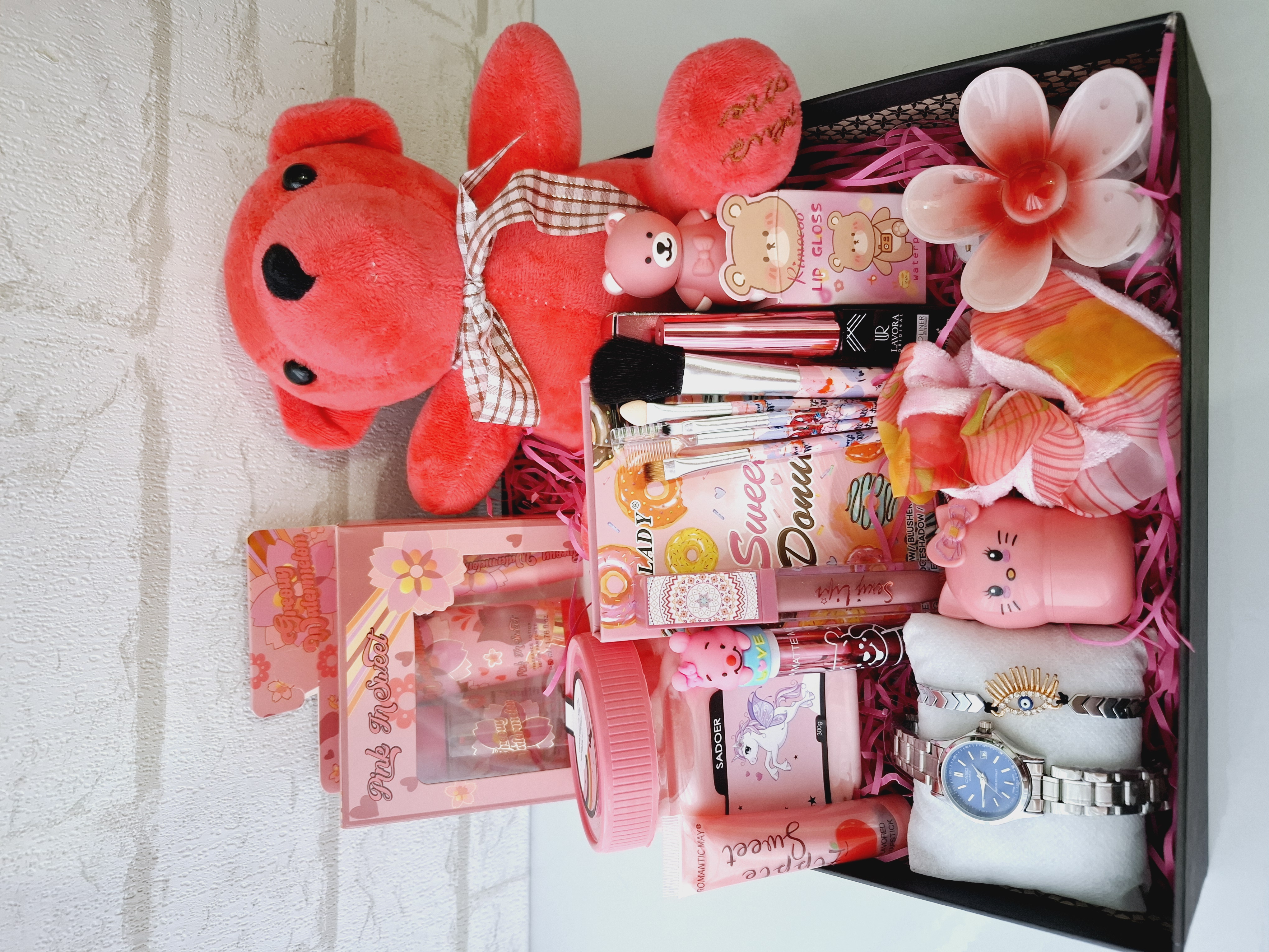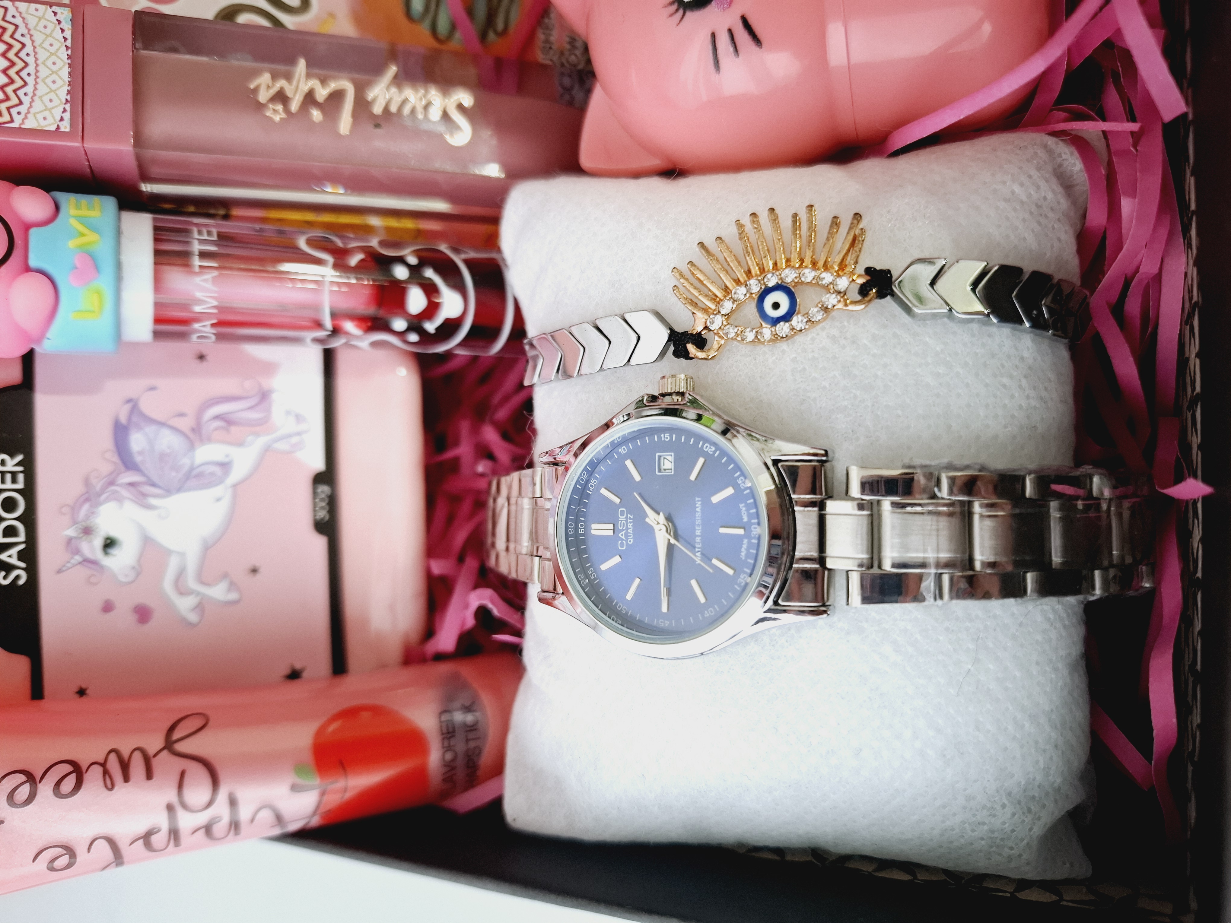 شامل ساعت بند فلزي استیل رنگ ثابت کاسیو تقویم دار کیفیت قوی، دستبند چشم نظر، خرس، پک عطر و لوسیون و بادی اسپلش اورجینال، پالت سایه چشم کیفی همه کاره،لیپ گلاس تیوپی، کیف جاکارتی فانتزی، لیپ مود فانتزی کیتی، ست براش، رژلب مایع ضدآب هندایان، تینت لب فانتزی، کره بدن یونیکورنی، لیپ گلاس خرسی جعبه دار، خط چشم ماژیکی کوزه ای ضدآب لاورا، کش مو، کلیپس، پوشال بهمراه جعبه کادویی سایز بزرگ