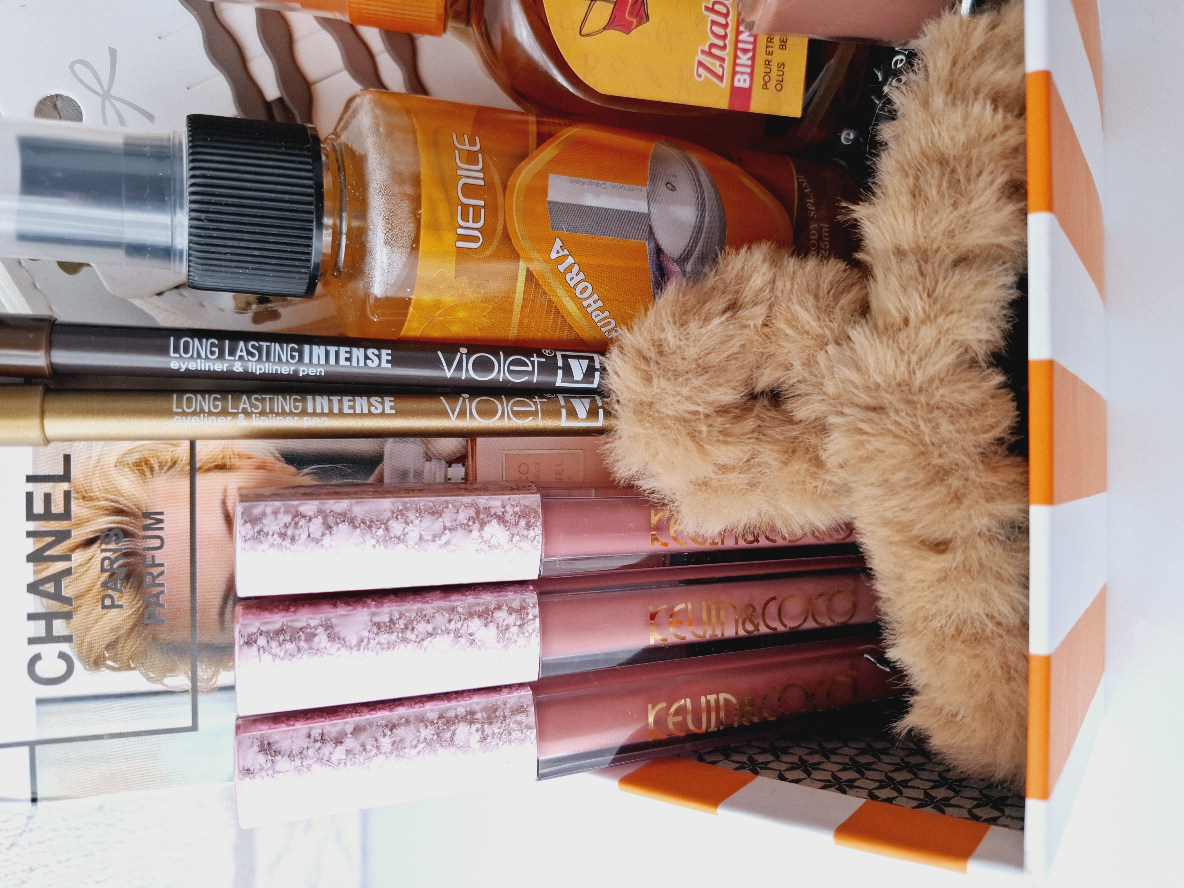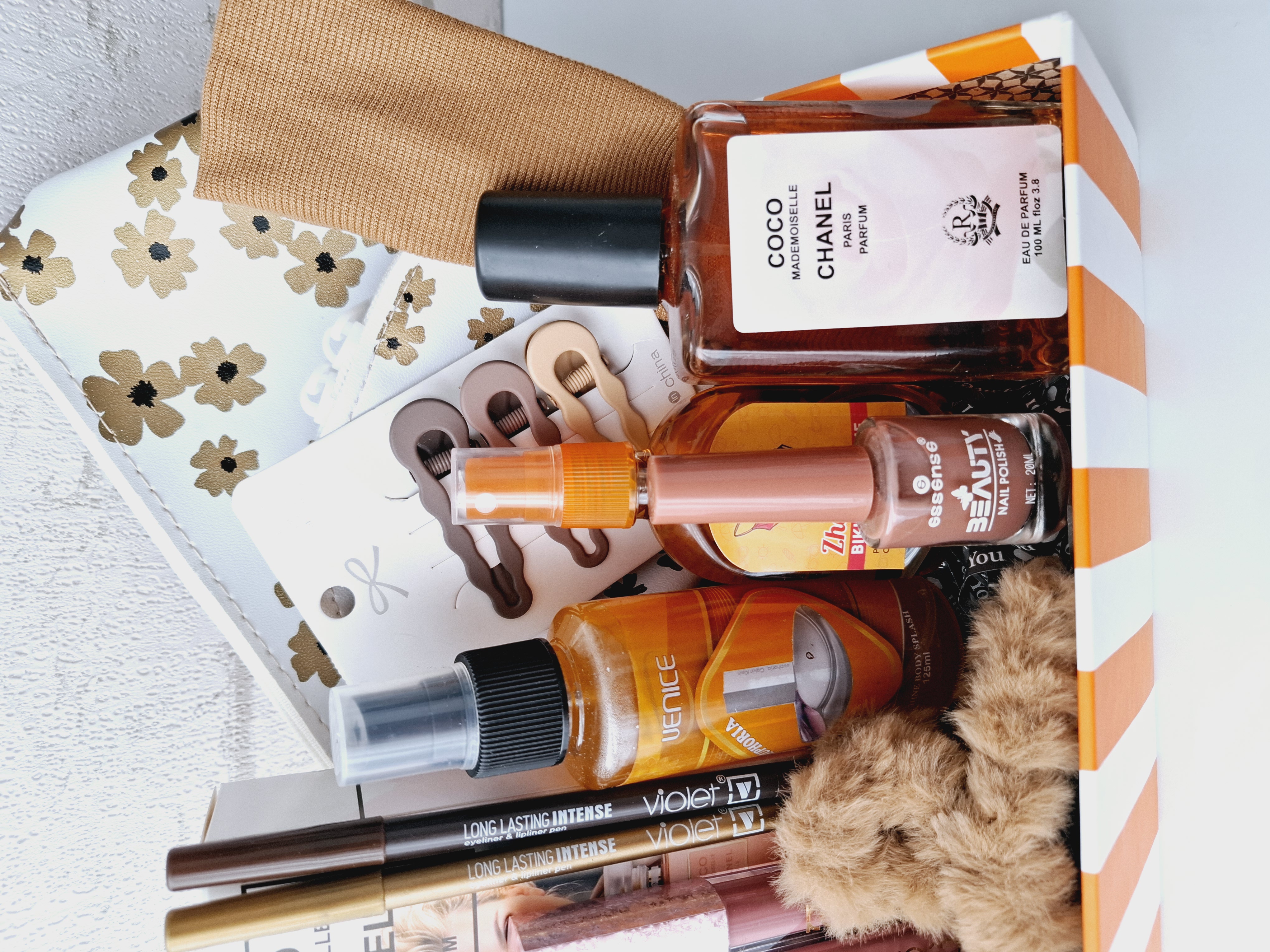 این باکس شامل ادکلن جعبه دار کوکو چنل با پخش بوی عالی و ماندگاری بالا، هدبند کبریتی، کیف ۲عددی آرایشی طرح بابونه، پک گیره مو، مداد چشم شمعی رنگی ۲عدد، کلیپس پشمالویی، عطر، لاک ناخن اسنس، بادی اسپلش، پک ۳تایی رژلب مایع ضدآب کوین کوکو، پوشال بهمراه جعبه کادویی