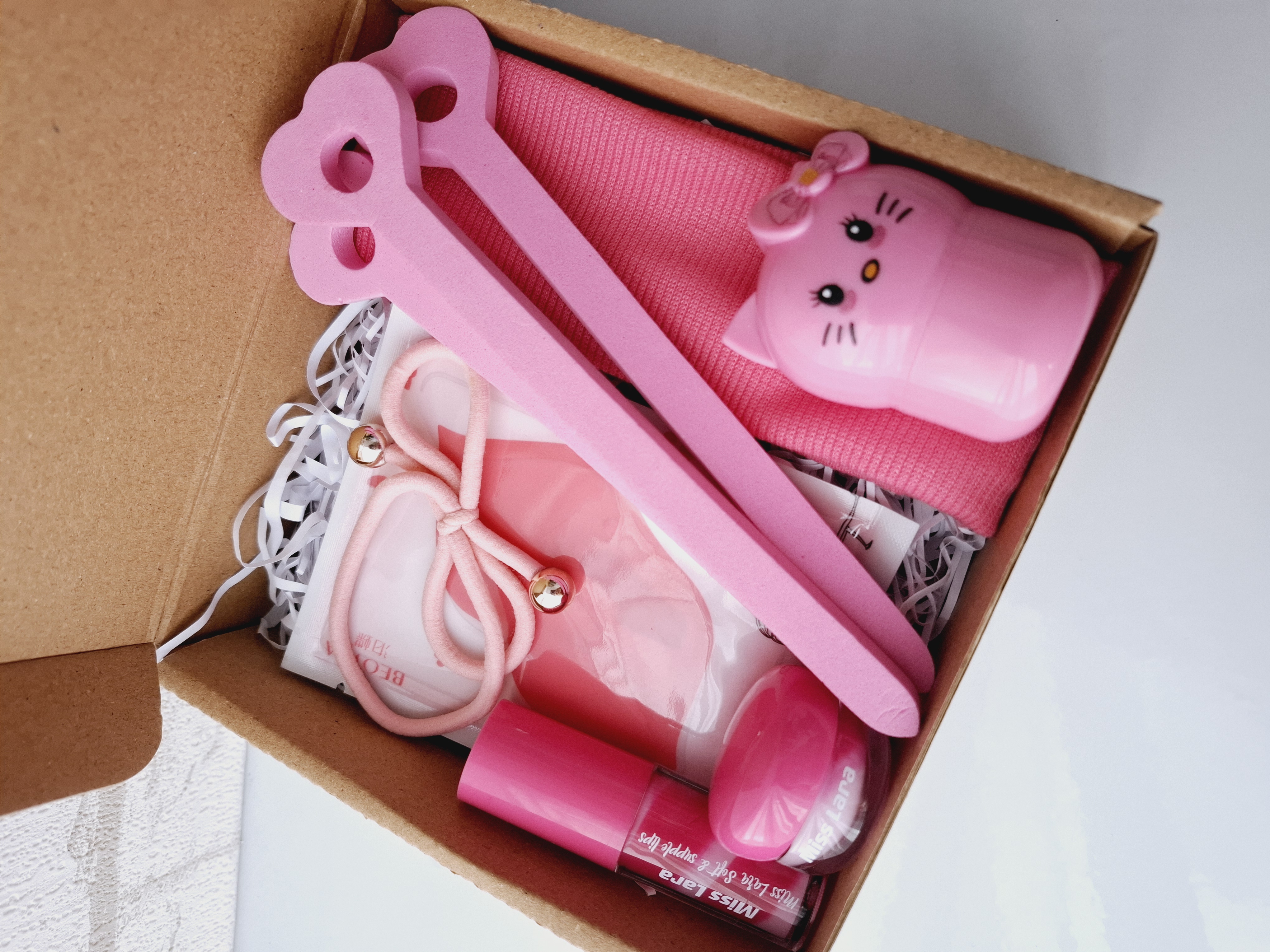 این باکس شامل بستنی لب، ماسک لب، کش مو، بیگودی فومی، هدبند کبریتی، لیپ مود فانتزی کیتی، پوشال بهمراه جعبه
