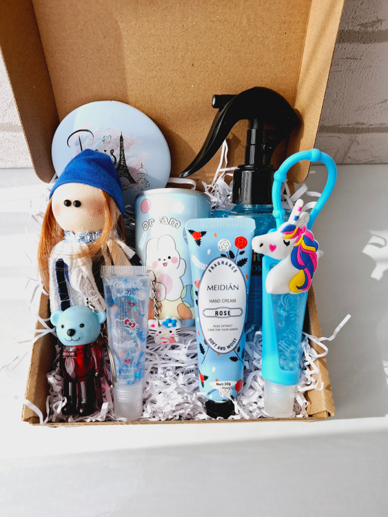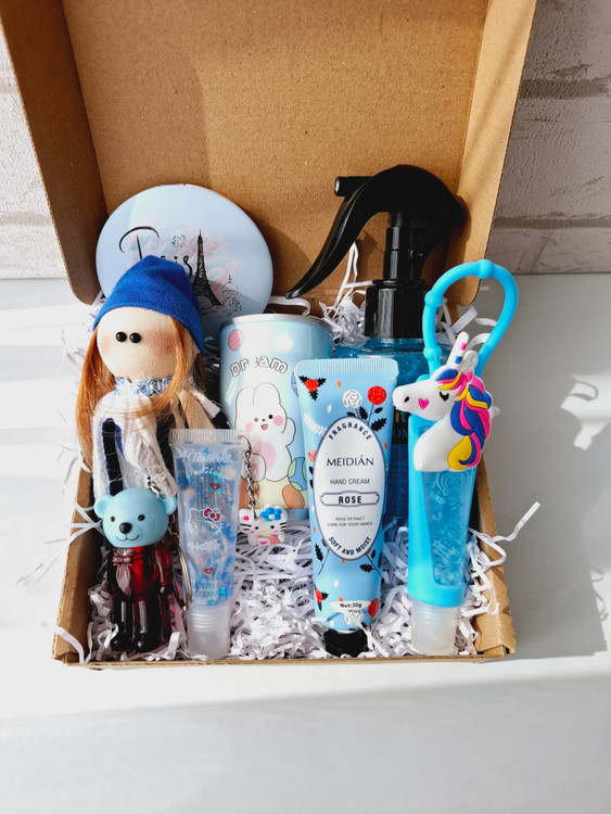 این باکس شامل دستمال مرطوب فانتزی، عروسک، آینه فانتزی، عطر مو، تینت لب فانتزی خرسی جاکلیدی، عطر مو کاریته، مرطوب کننده جیبی، برق لب فانتزی عروسکی، لیپ گلاس یونیکورنی، پوشال بهمراه جعبه