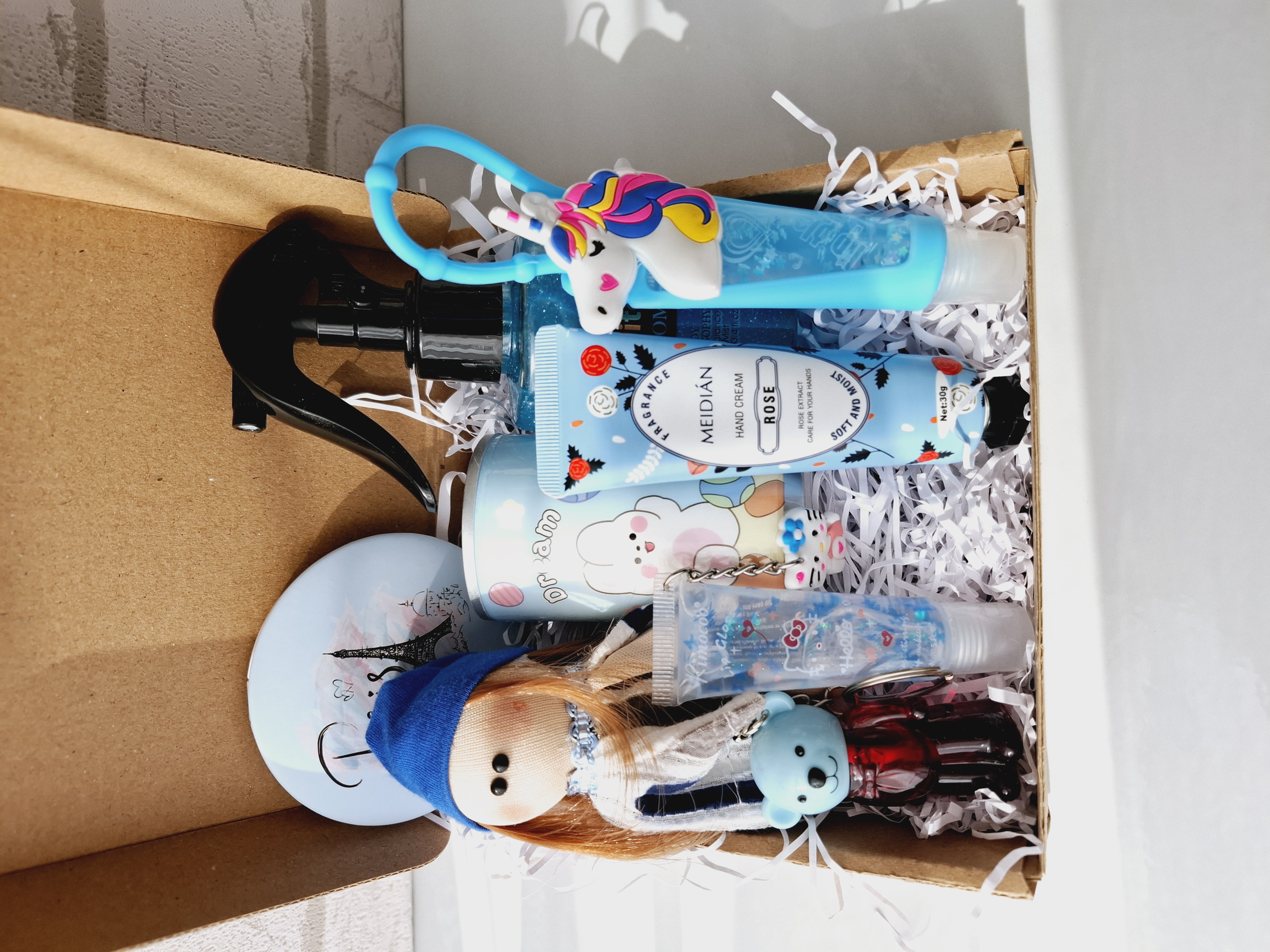 این باکس شامل دستمال مرطوب فانتزی، عروسک، آینه فانتزی، عطر مو، تینت لب فانتزی خرسی جاکلیدی، عطر مو کاریته، مرطوب کننده جیبی، برق لب فانتزی عروسکی، لیپ گلاس یونیکورنی، پوشال بهمراه جعبه