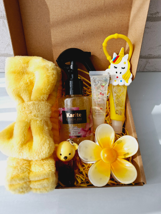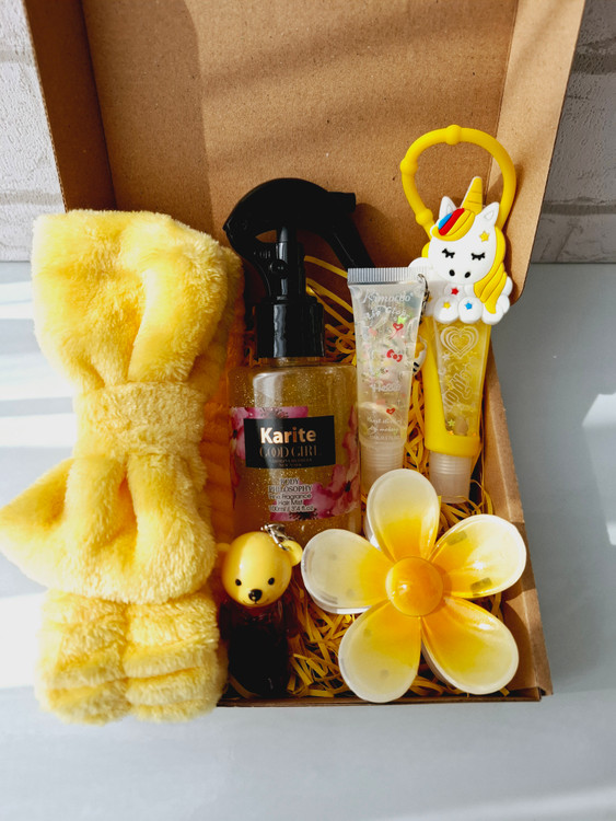 شامل عطر مو/هدبند حوله ای پاپیونی/لیپ گلاس فانتزی عروسکی/تینت لب فانتزی عروسکی اسنس جاکلیدی/کلیپس پلومریا/لیپ گلاس تیوپی عروسکی/پوشال بهمراه جعبه
