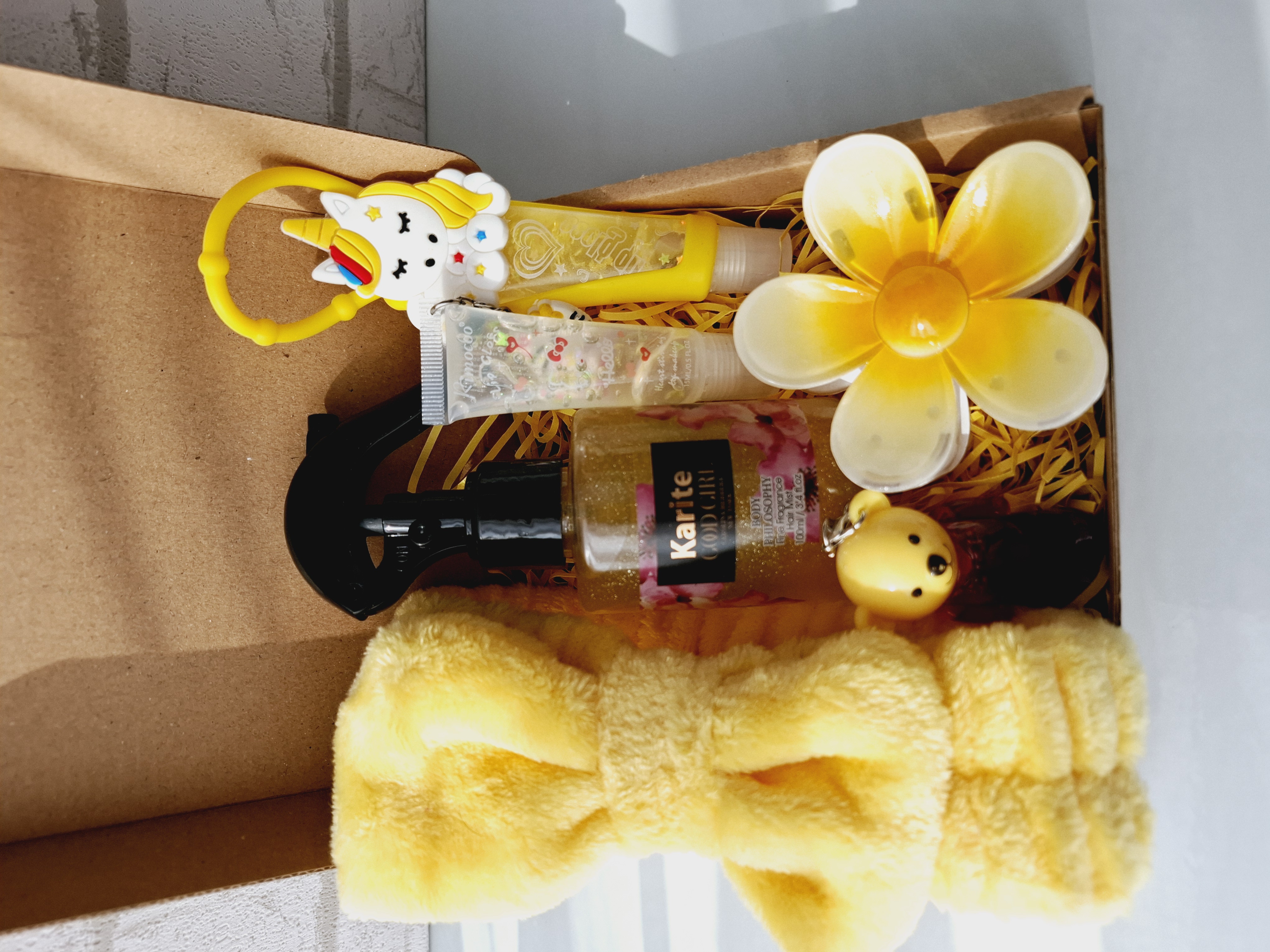 شامل عطر مو/هدبند حوله ای پاپیونی/لیپ گلاس فانتزی عروسکی/تینت لب فانتزی عروسکی اسنس جاکلیدی/کلیپس پلومریا/لیپ گلاس تیوپی عروسکی/پوشال بهمراه جعبه