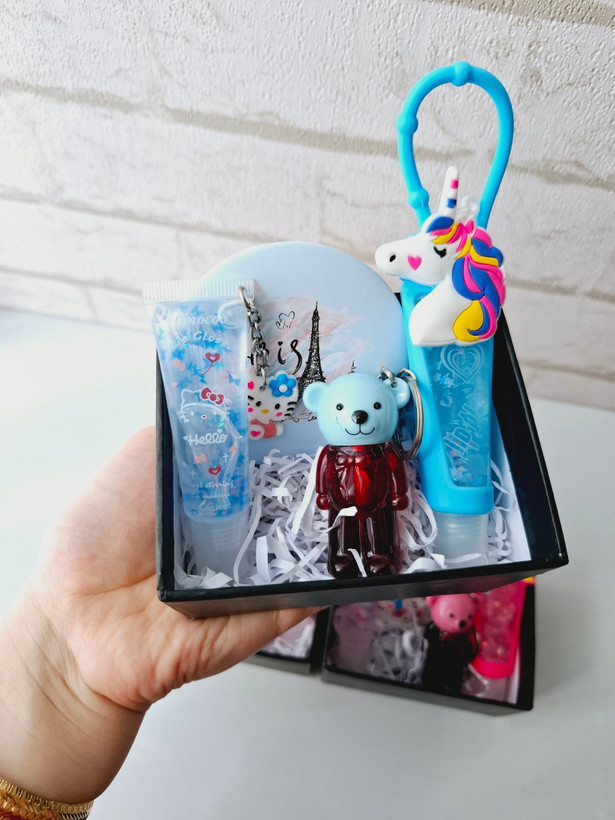 شامل آینه فانتزی دوطرفه، لیپ گلاس یونیکورنی، تینت لب فانتزی عروسکی اسنس جاکلیدی، لیپ گلاس تیوپی عروسکی آویز دار،پوشال بهمراه جعبه کادویی