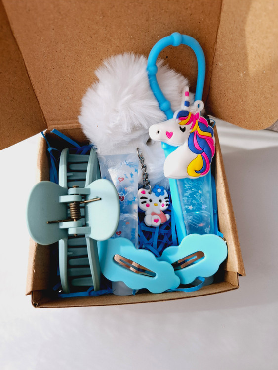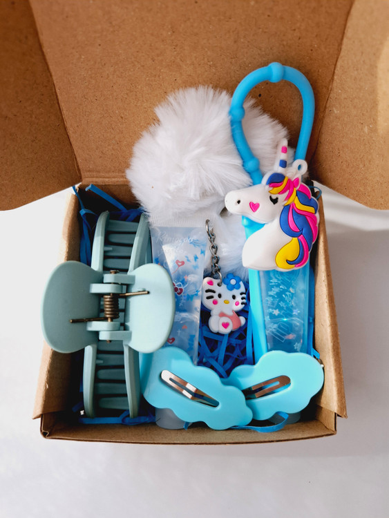 💙پک آبی شامل لیپ گلاس یونیکورنی، کش مو، تق تقی،کلیپس سایز بزرگ، لیپ گلاس تیوپی آویز دار رومانتیک،پوشال و جعبه