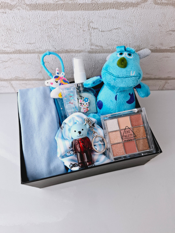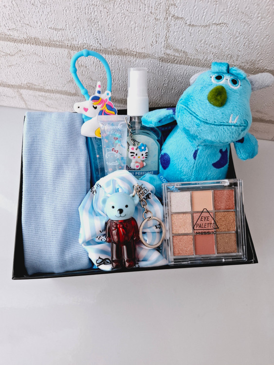 شامل عروسک آویز دار سالیوان، پالت سایه ۹رنگ میسی، عطر بیک.ینی، لیپ گلاس تیوپی آویز دار رومانتیک، تینت لب فانتزی عروسکی اسنس، لیپ گلاس یونیکورنی، هدبند کبریتی، کش مو ساتن، پوشال بهمراه جعبه کادویی