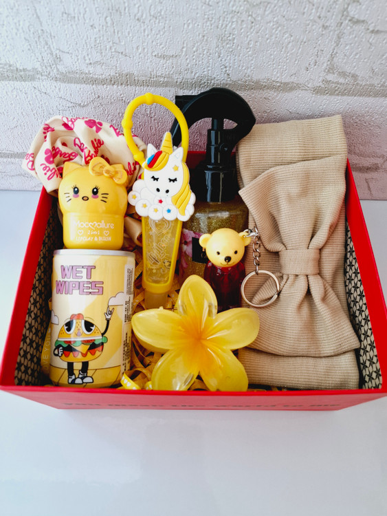 شامل هدبند کبریتی پاپیونی، عطر مو، کلیپس پلومریا، دستمال مرطوب فانتزی، لیپ مود فانتزی کیتی، تینت لب فانتزی اسنس، لیپ گلاس تیوپی آویز دار رومانتیک، کش مو، باکس و پوشال