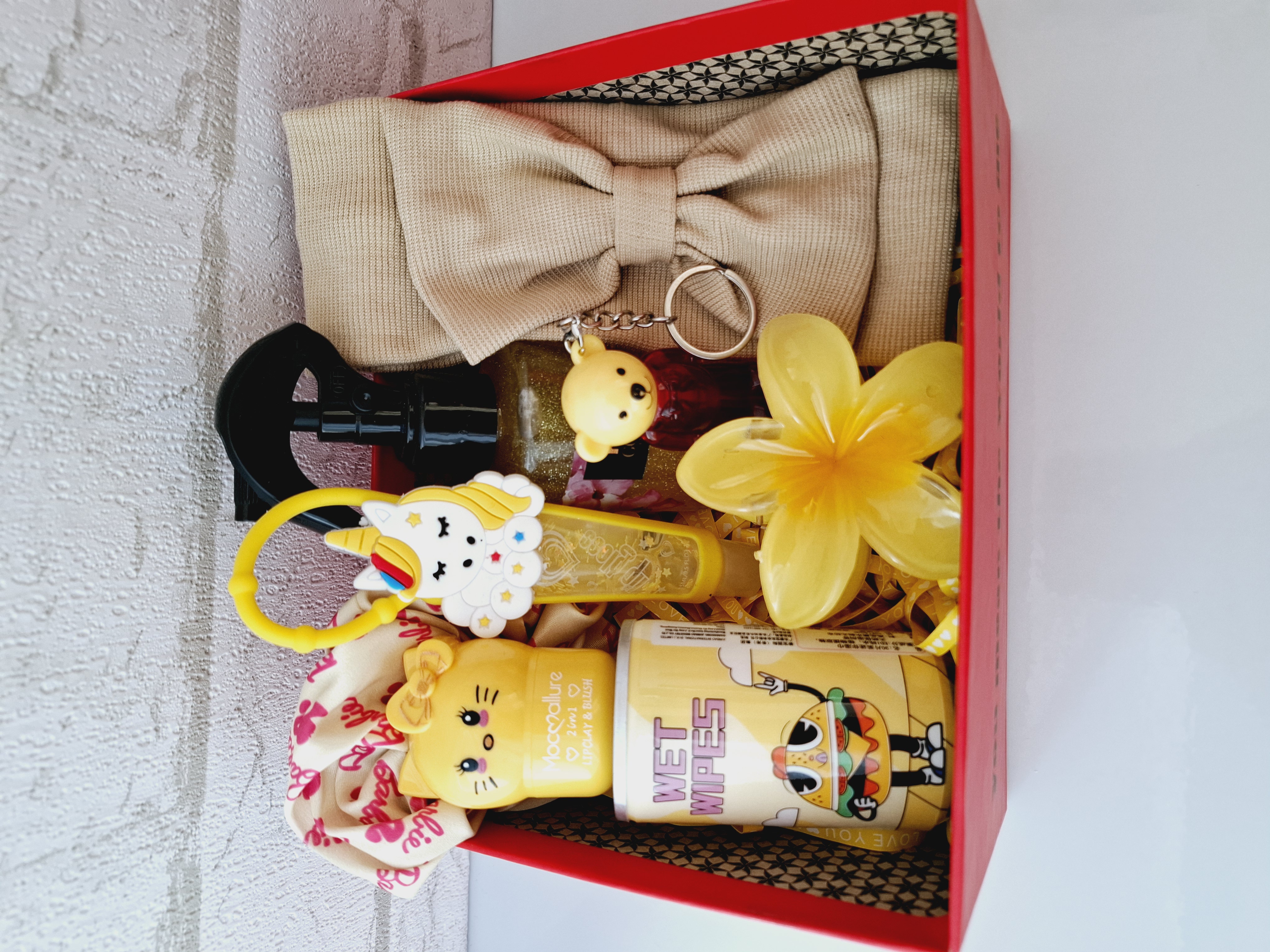 شامل هدبند کبریتی پاپیونی، عطر مو، کلیپس پلومریا، دستمال مرطوب فانتزی، لیپ مود فانتزی کیتی، تینت لب فانتزی اسنس، لیپ گلاس تیوپی آویز دار رومانتیک، کش مو، باکس و پوشال