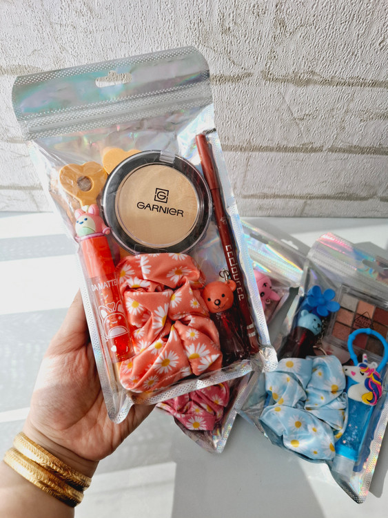 هر پک شامل چند محصول کیوت و کاربردیه که بصورت رندوم بالم لب، برق لب، پالت سایه، پنکک، رژلب، خرس، عروسک، کش مو، تق تقی و...گذاشته میشه