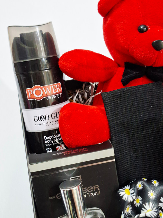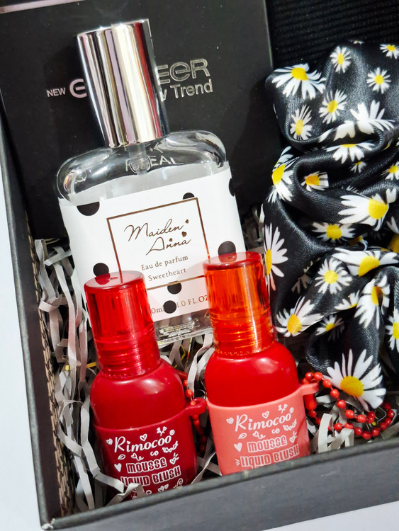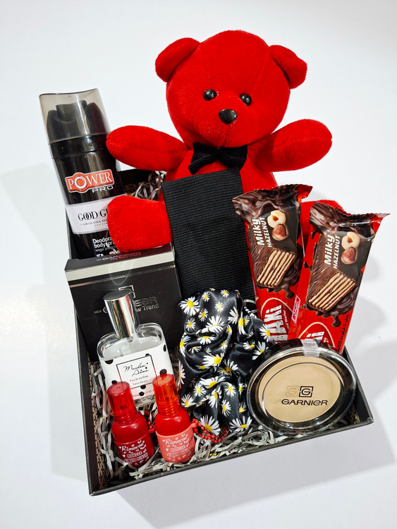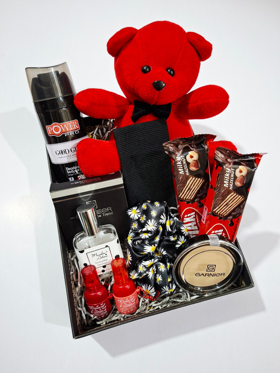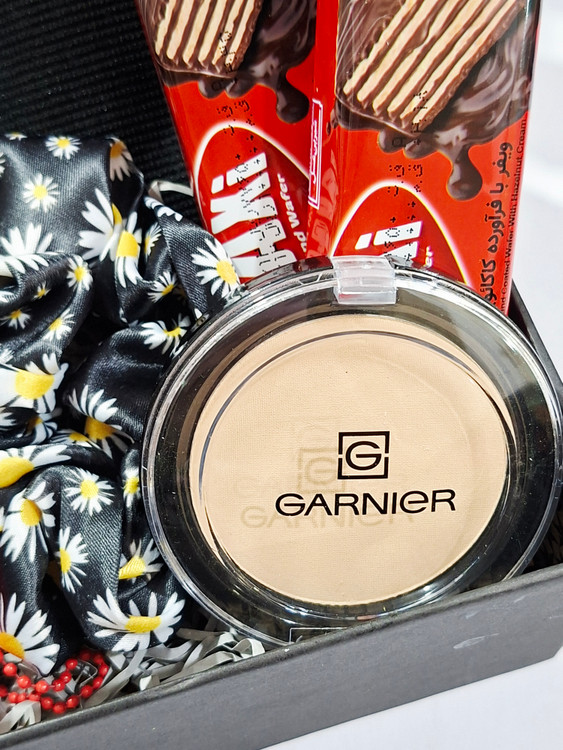 خرس، اسپری بدن رایحه گودگرل، هدبند کبریتی، پنکک گارنیر، کش مو، ۲عدد شکلات کاکائویی، ادکلن، ۲عدد رژلب مایع ۲۴ساعته ریموکو، پوشال و جعبه کادو