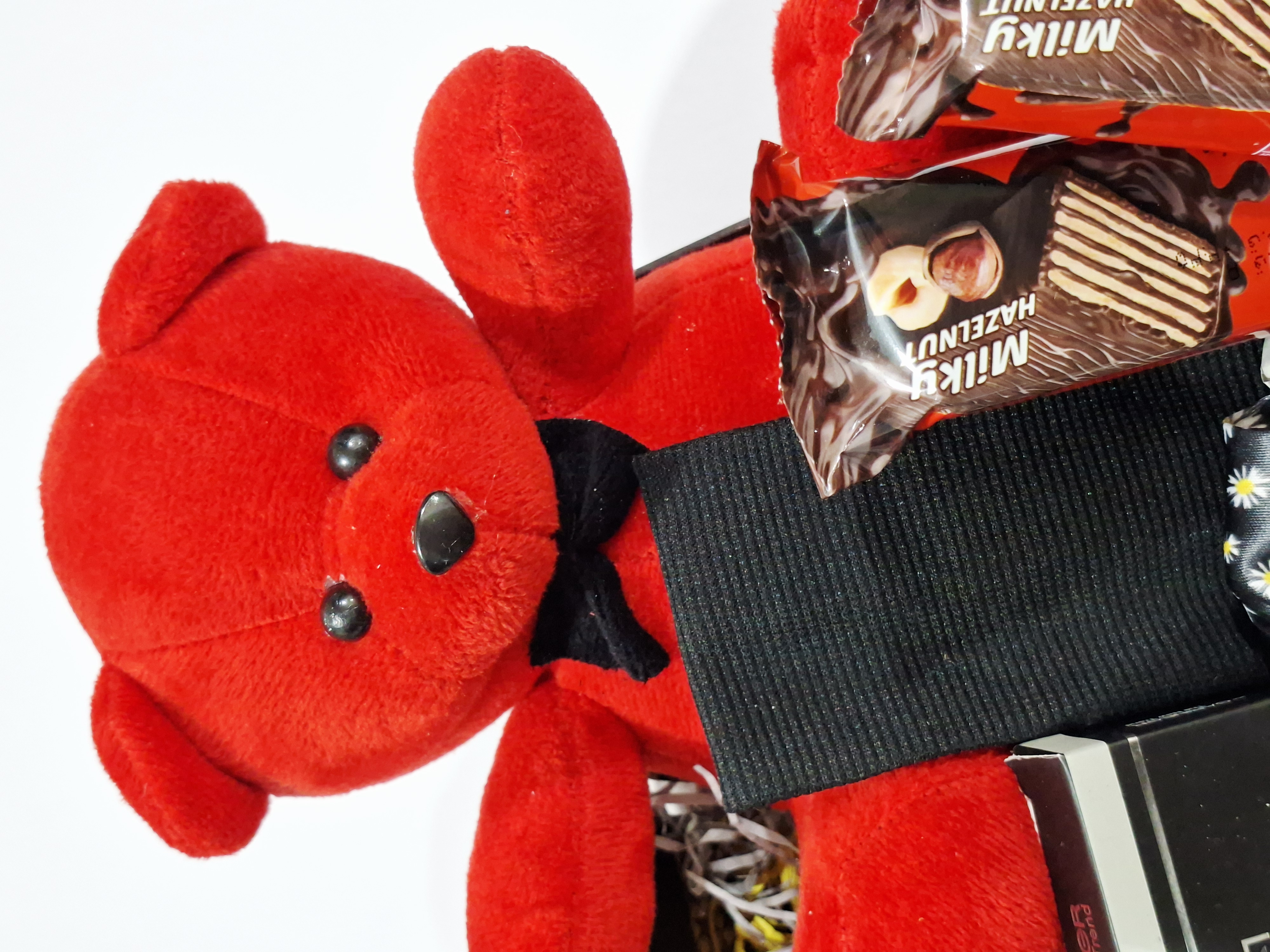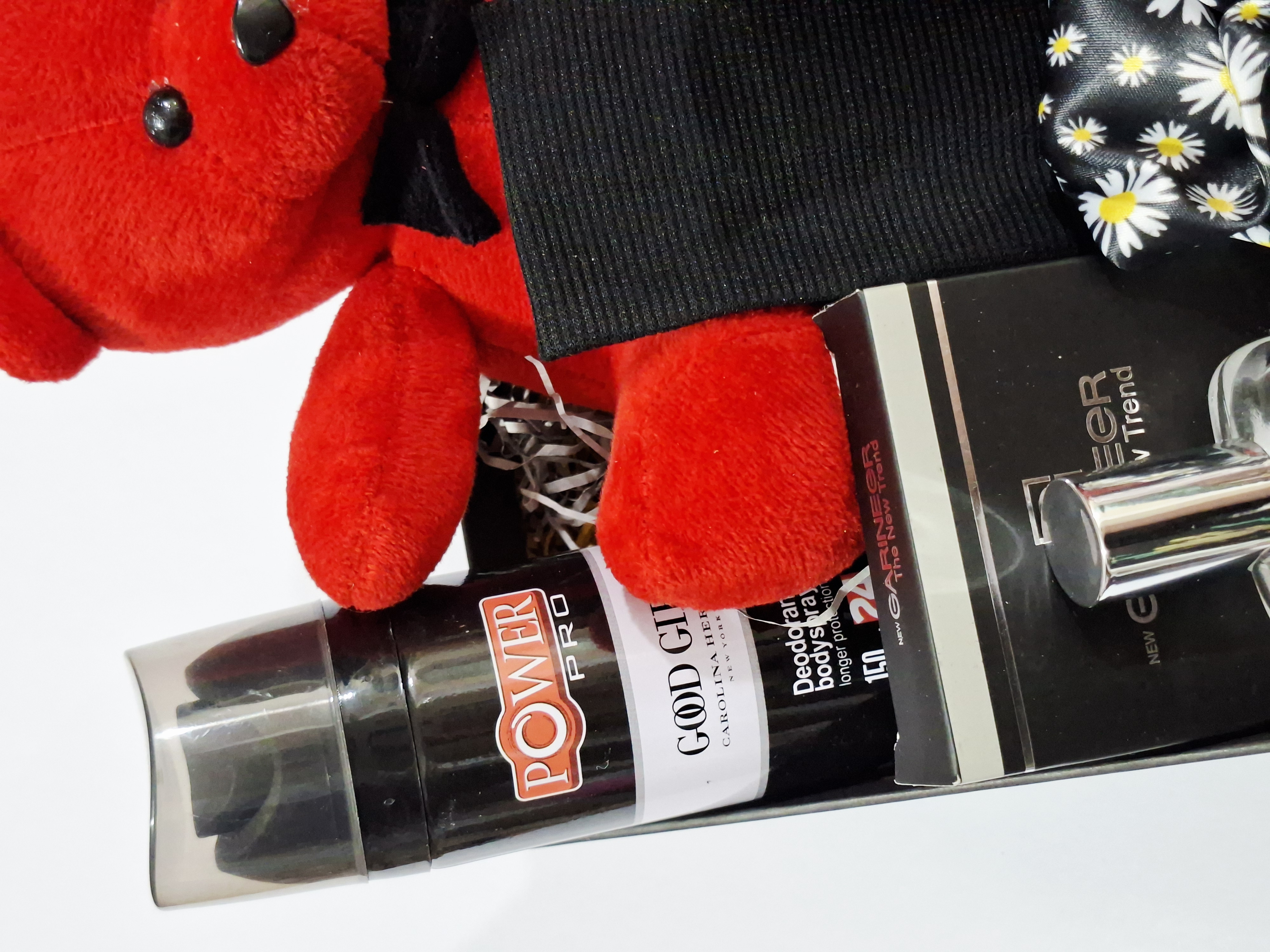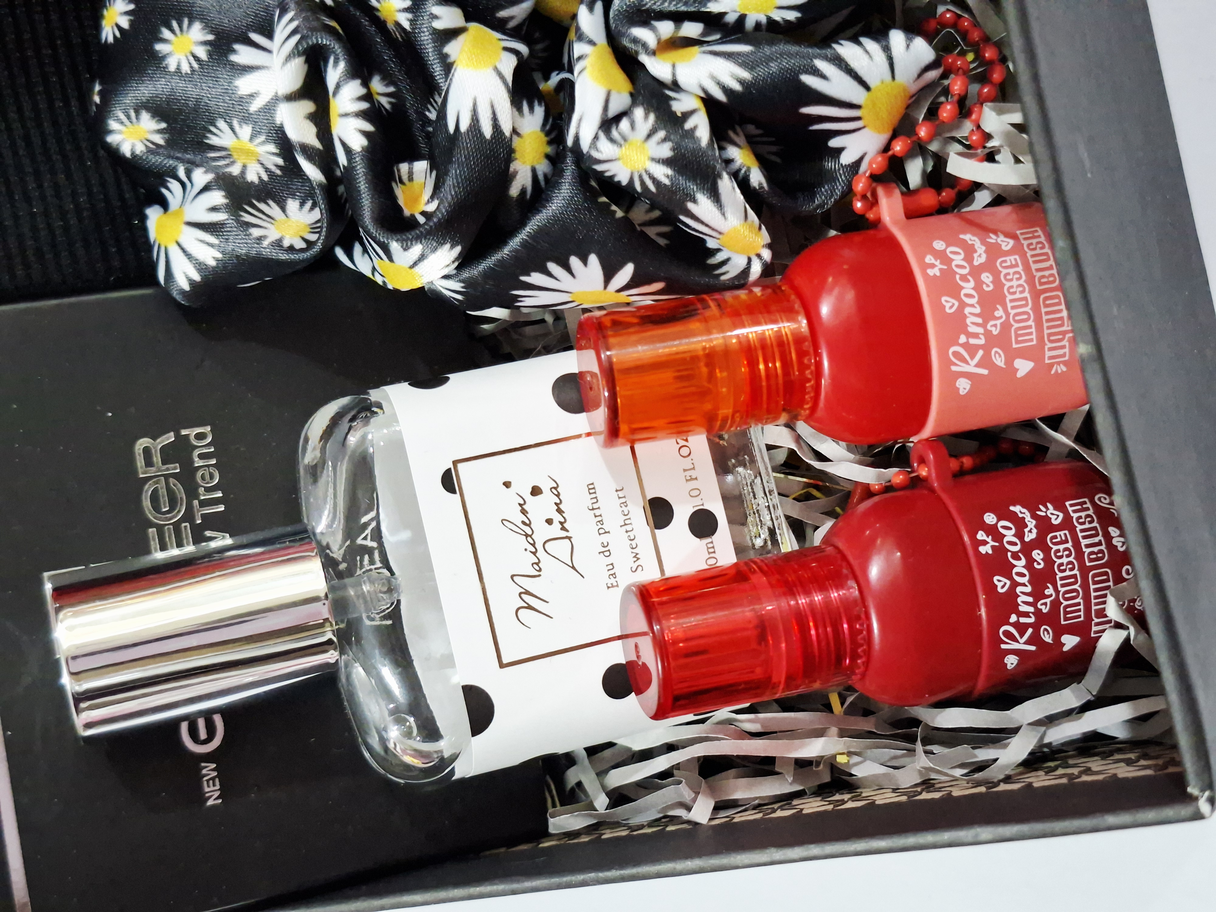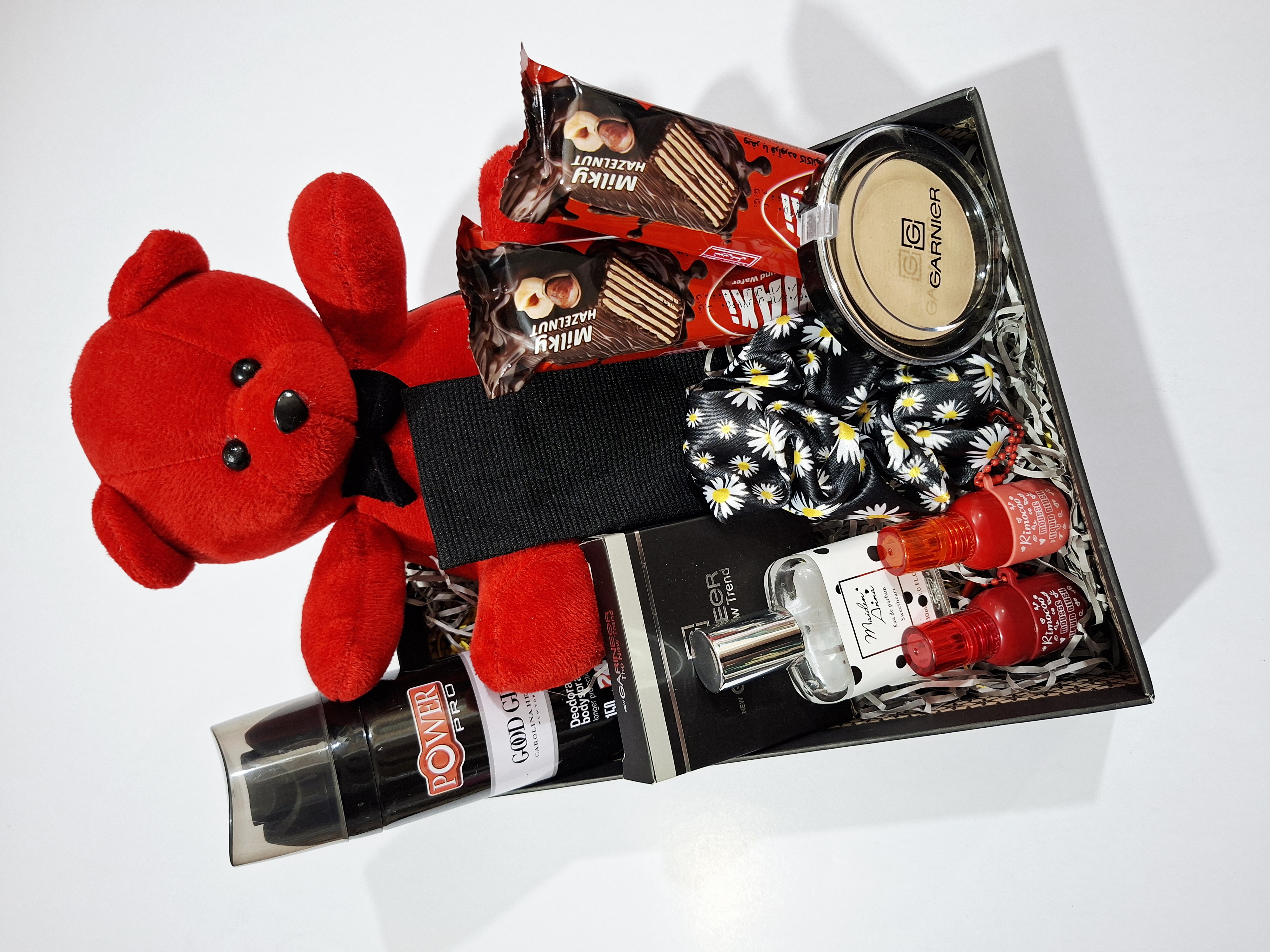 خرس، اسپری بدن رایحه گودگرل، هدبند کبریتی، پنکک گارنیر، کش مو، ۲عدد شکلات کاکائویی، ادکلن، ۲عدد رژلب مایع ۲۴ساعته ریموکو، پوشال و جعبه کادو