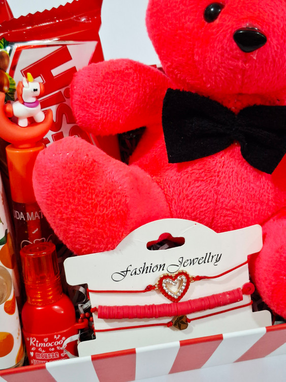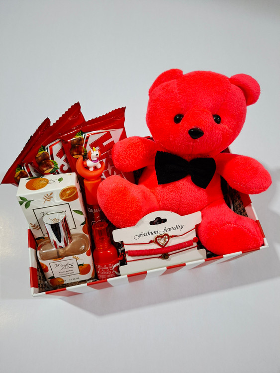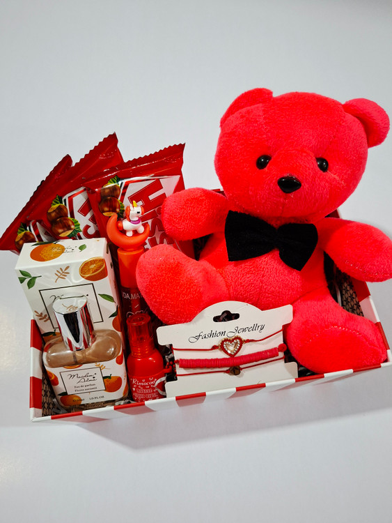 شامل عروسک خرسی، ۳عدد شکلات کاکائویی، پک دستبند دخترونه، برق لب عروسکی، رژلب مایع ۲۴ساعته کیس بیوتی، ادکلن جعبه دار با پخش بوی عالی و ماندگاری بالا، پوشال و جعبه کادو