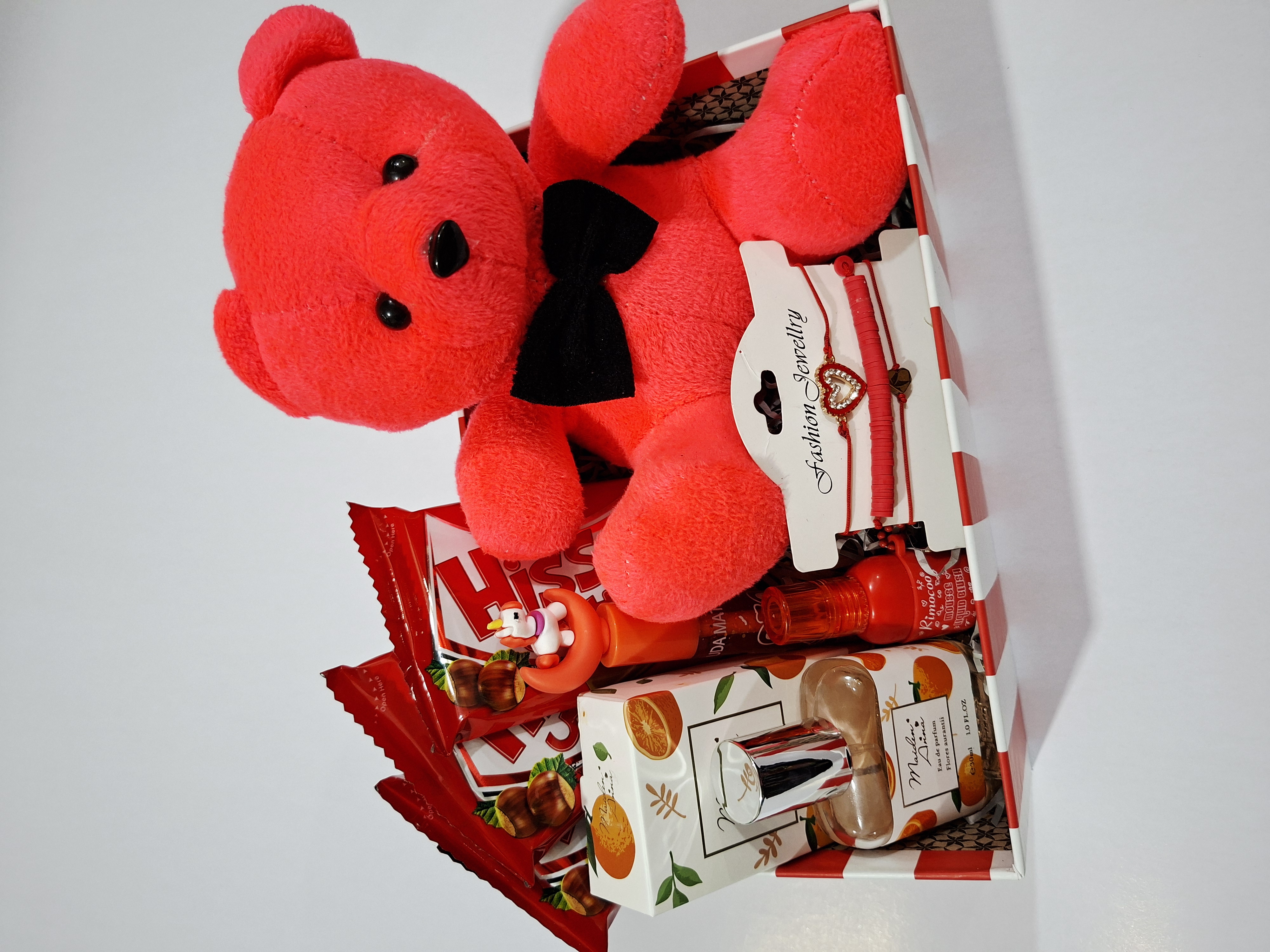 شامل عروسک خرسی، ۳عدد شکلات کاکائویی، پک دستبند دخترونه، برق لب عروسکی، رژلب مایع ۲۴ساعته کیس بیوتی، ادکلن جعبه دار با پخش بوی عالی و ماندگاری بالا، پوشال و جعبه کادو