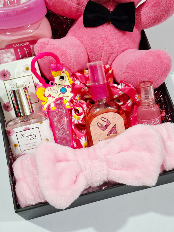 شامل عروسک خرسی، کش مو، لیپ گلاس فانتزی، هدبند حوله ای پاپیونی، رژلب مایع آویز دار ریموکو، ادکلن جعبه دار با پخش بوی عالی و ماندگاری بالا، کش مو، عطر، پوشال و جعبه کادو