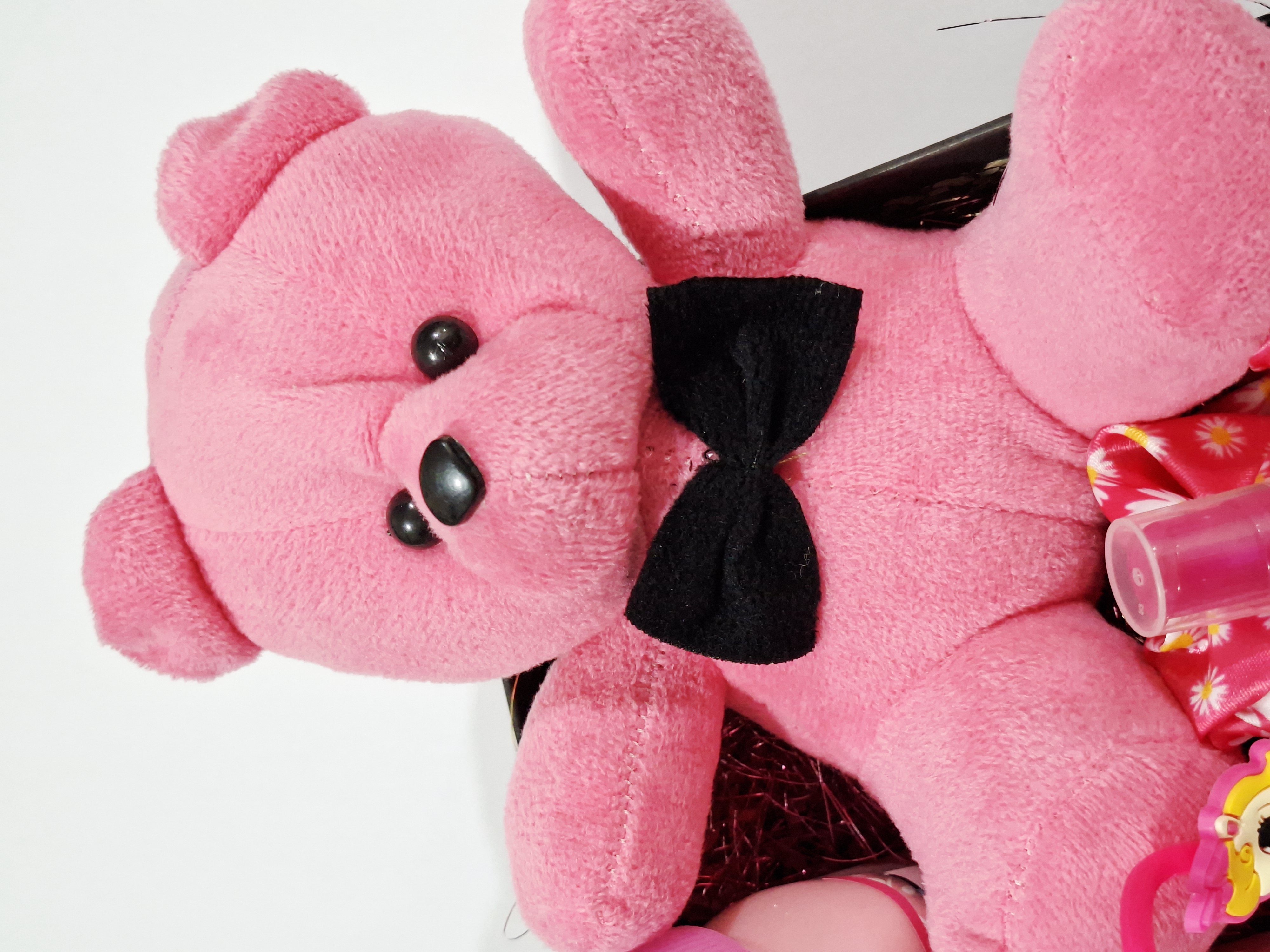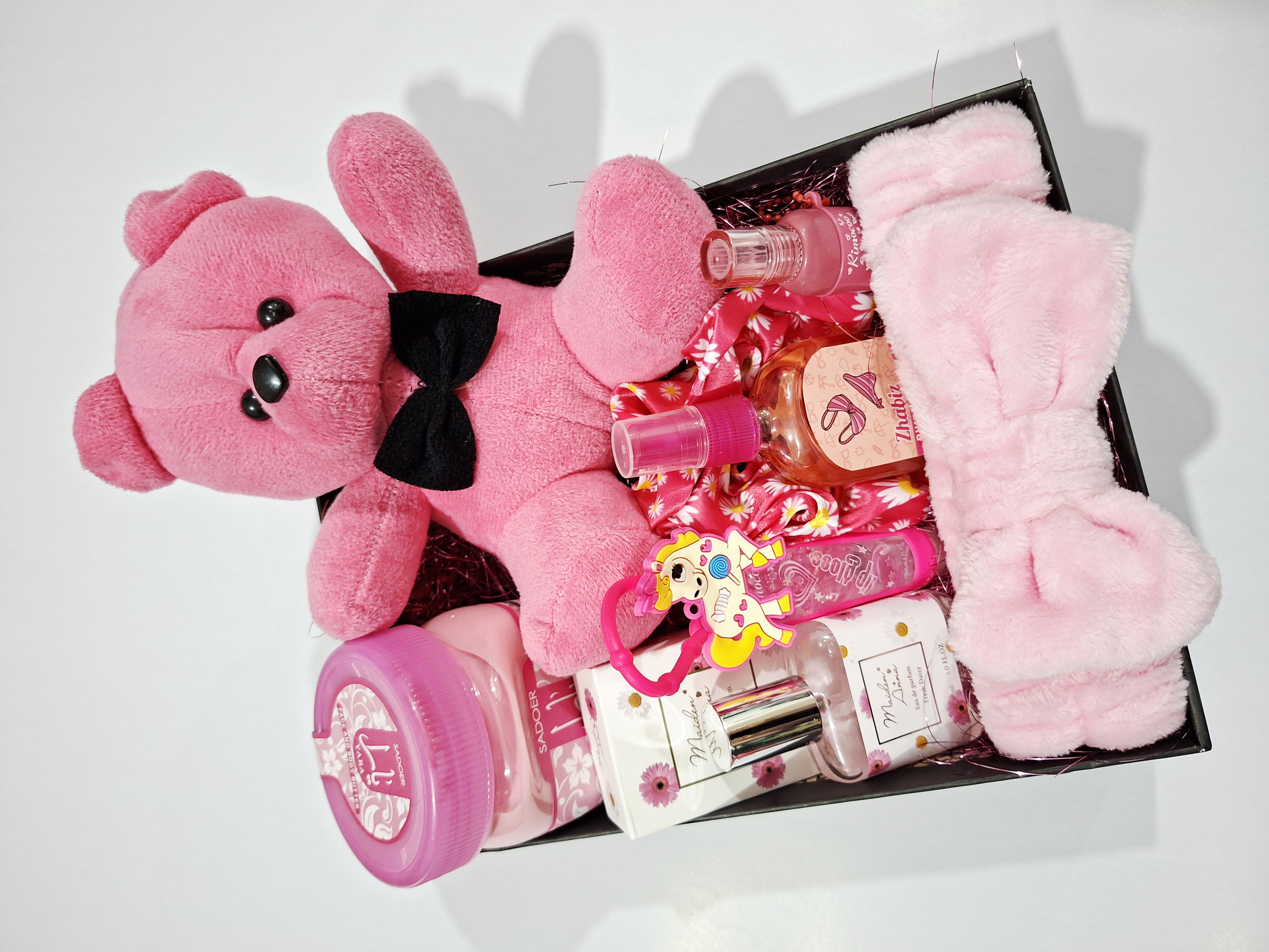 شامل عروسک خرسی، کش مو، لیپ گلاس فانتزی، هدبند حوله ای پاپیونی، رژلب مایع آویز دار ریموکو، ادکلن جعبه دار با پخش بوی عالی و ماندگاری بالا، کش مو، عطر، پوشال و جعبه کادو