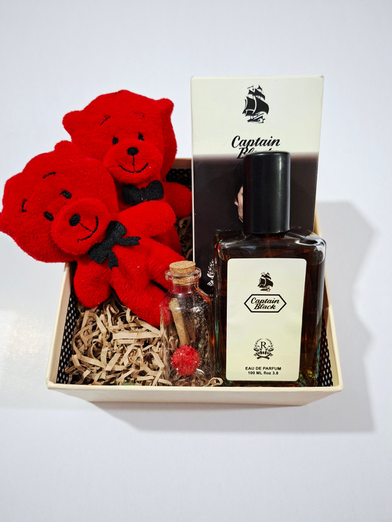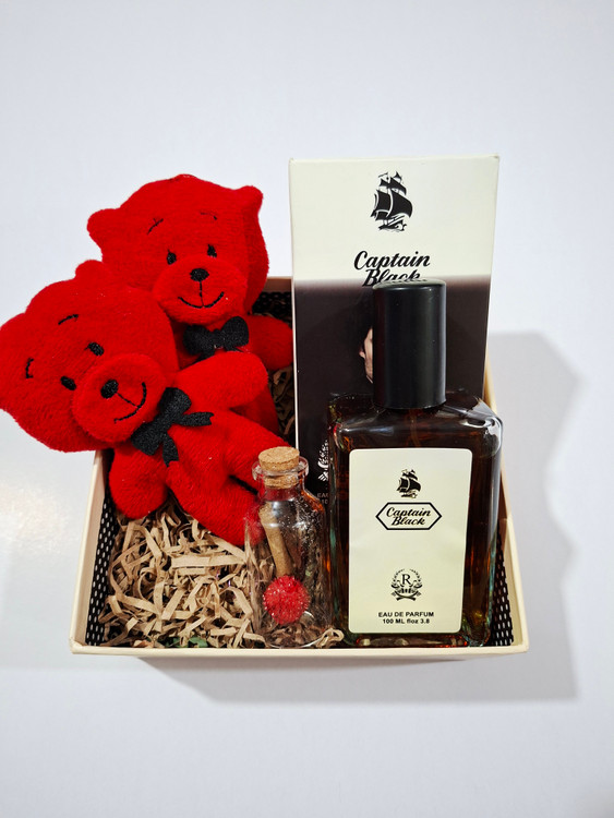 شامل ادکلن ۱۰۰میل کاپیتان بلک، ۲عدد عروسک خرسی، شیشه عشق، پوشال و جعبه کادو